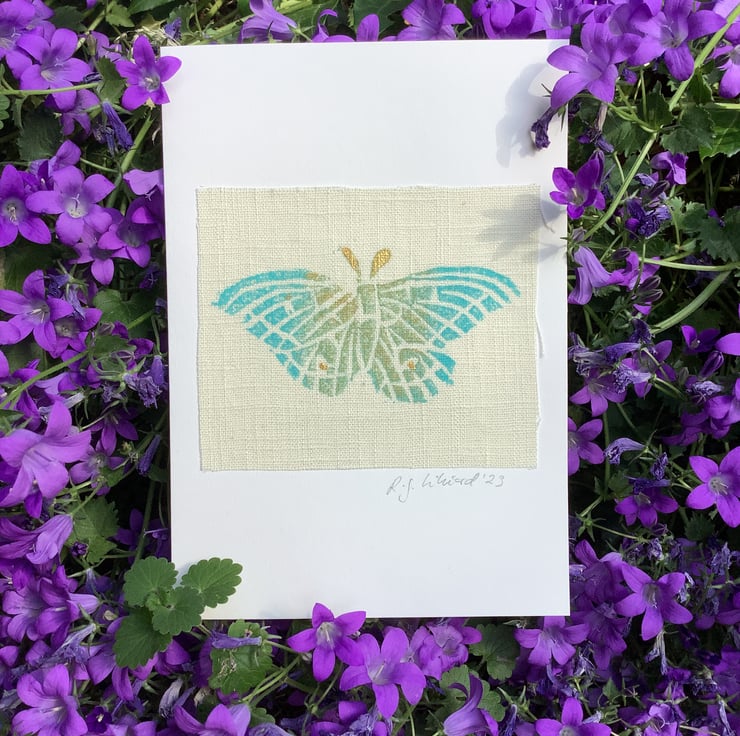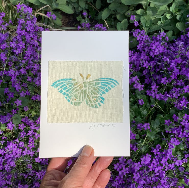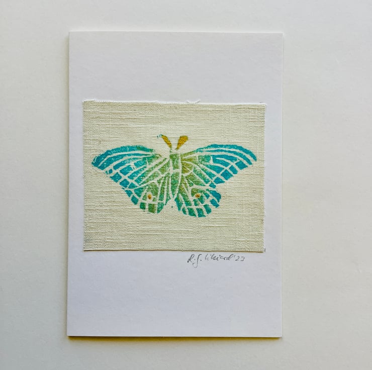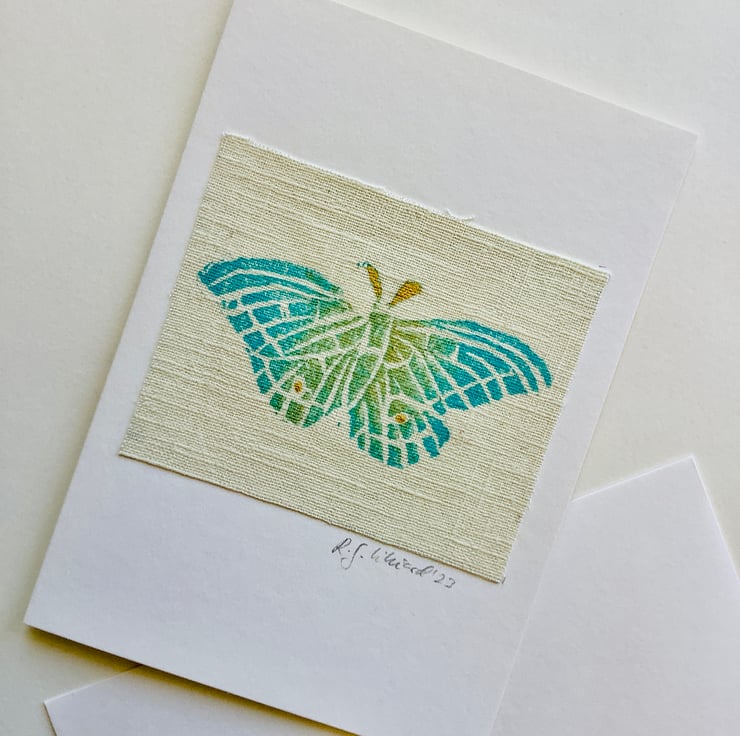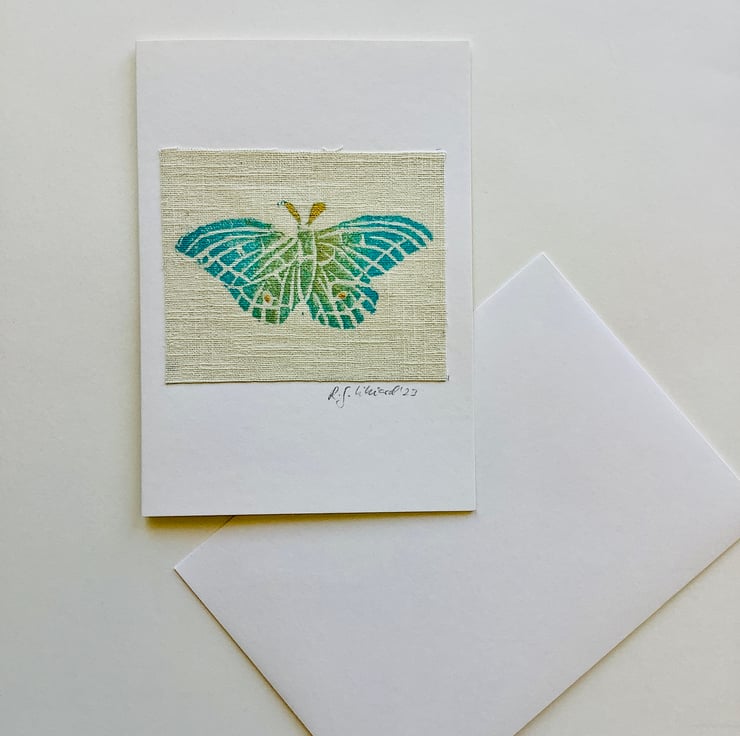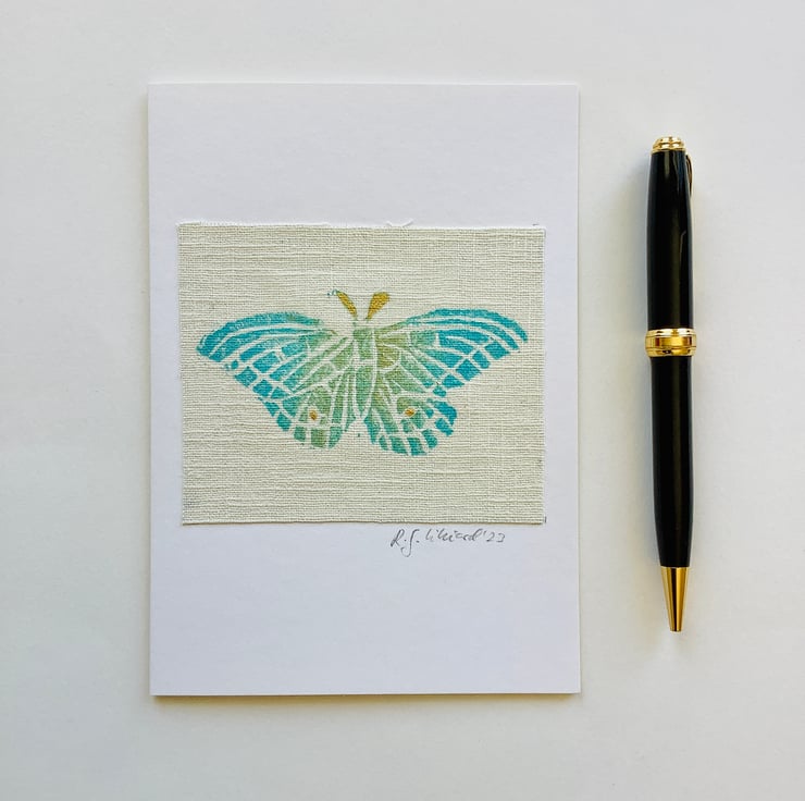 Lovingly designed greeting card that features beautifully hand block printed Butterfly inspired by nature, hand carved into lino block and then hand printed on natural Eco-friendly 100% linen. The print on linen fabric is then placed onto 100% recycled acid free paper. It is blank inside and perfect for writing that special message. It comes with a white recycled envelope.