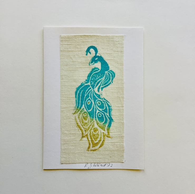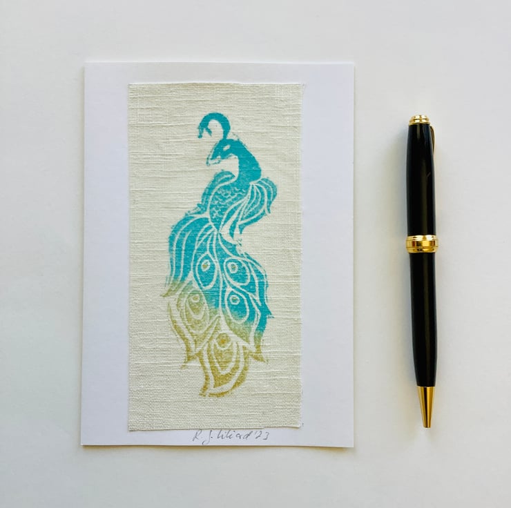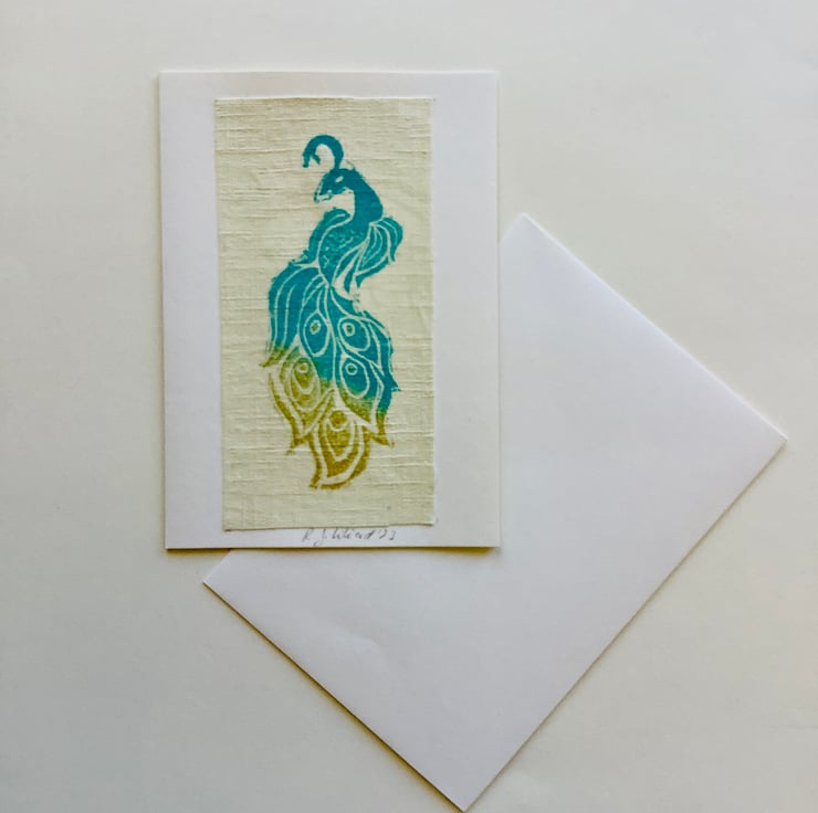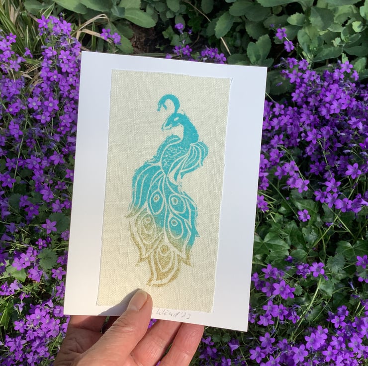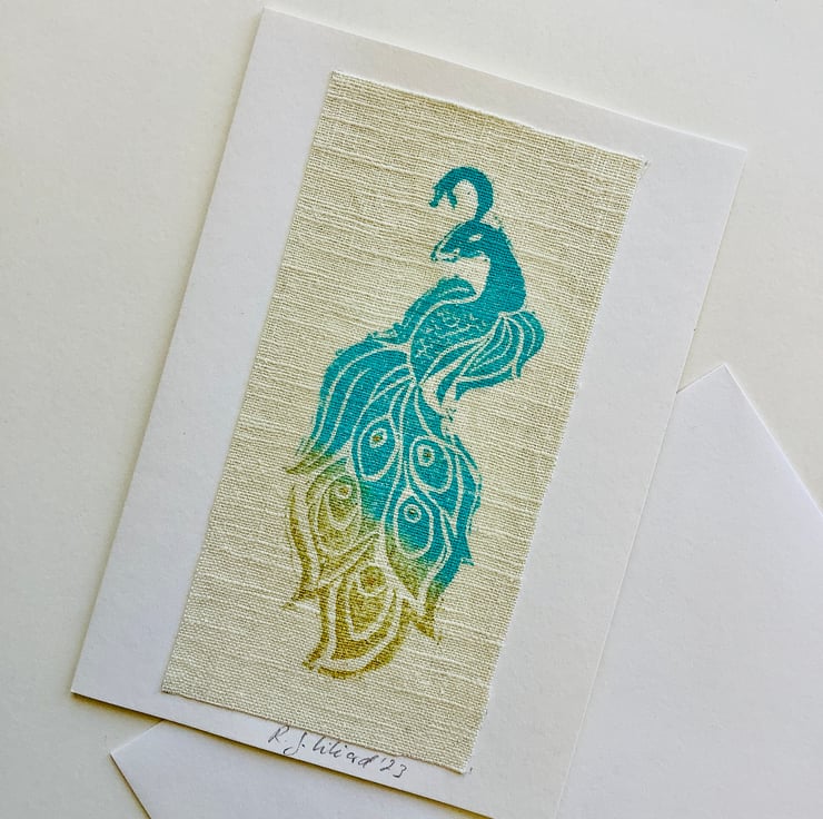 Lovingly designed greeting card that features beautifully hand block printed Peacock inspired by nature, hand carved into lino block and then hand printed on natural Eco-friendly 100% linen. The print on linen fabric is then placed onto 100% recycled acid free paper. It is blank inside and perfect for writing that special message. It comes with a white recycled envelope.