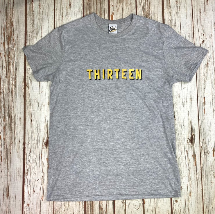 Here is our THIRTEEN SHIRT, in our very own BINGLEY BANG typeface!