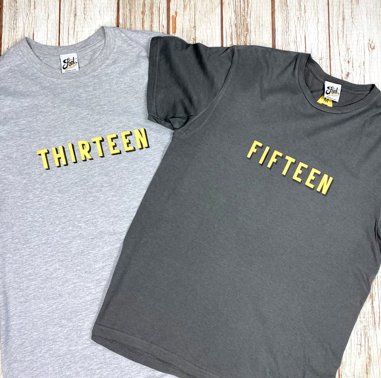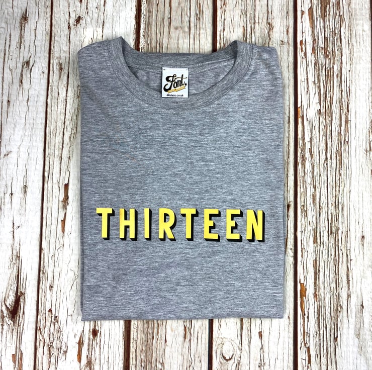 We've used a high-quality T-shirt suitable for any thirteen year-old, available in three colours- white, pale (heather) grey, and a darker (charcoal) grey. It's also available in children AND adult sizes. This number is made up of shiny gold and black shadow!