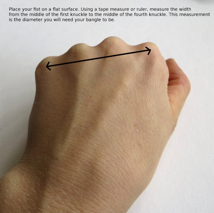 Size: currently available in a Small - 60mm / Medium - 65mm / Large - 70mm / Extra large - 75mm internal diameter. Other sizes can be made to order, please contact me for a custom listing. To work out what size you need, take a look at the last photo which shows how to measure across your hand.
