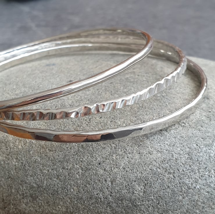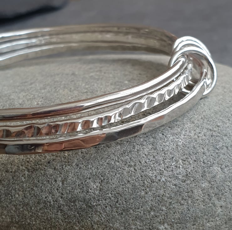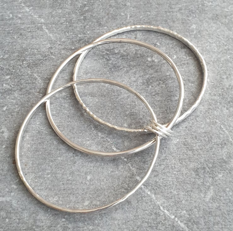 This sterling silver bangle set has been handmade using traditional silversmithing techniques. The set of three bangles are formed from heavy gauge wire which I've shaped and textured: two have different hammer textures and one has been left smooth. I've linked the bangles together with three spinner rings, also with a smooth finish. The entire set has been given a bright shiny polish - a perfect piece of classic silver jewellery which is made to last!
