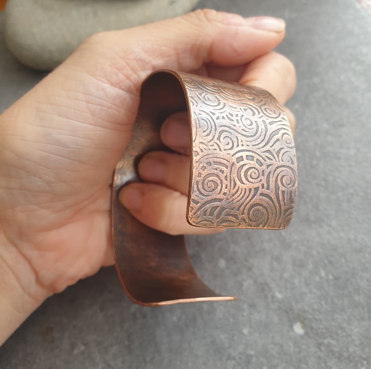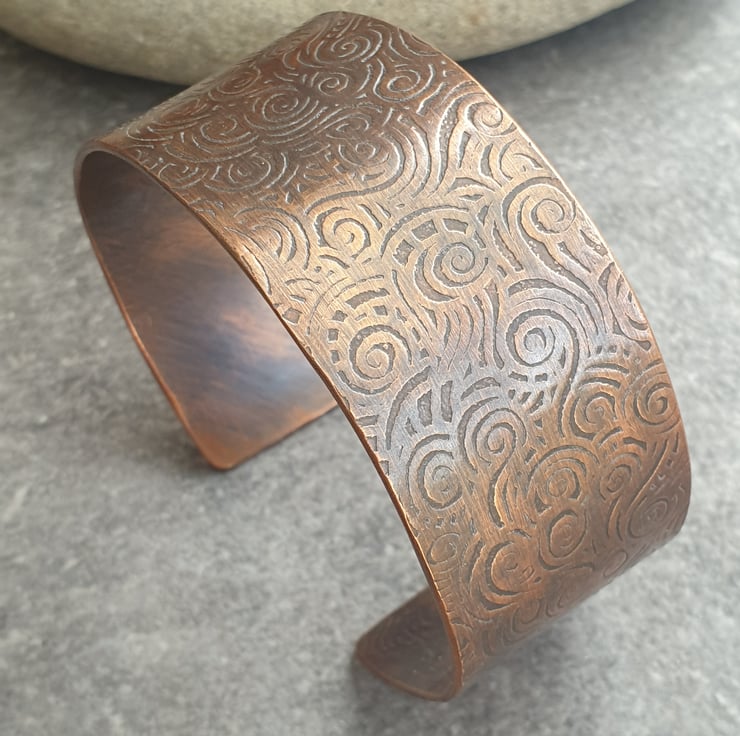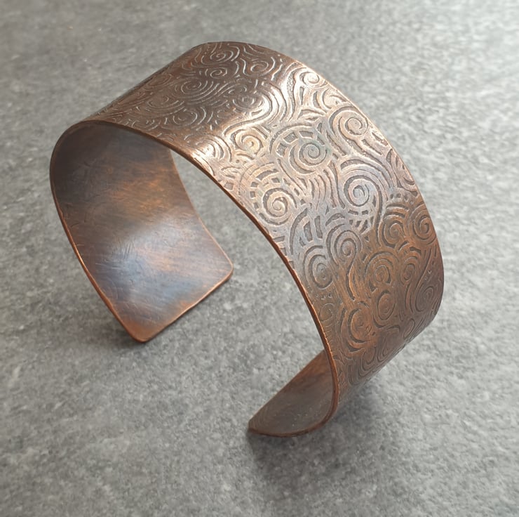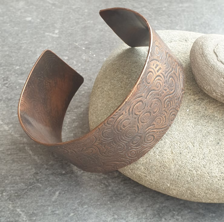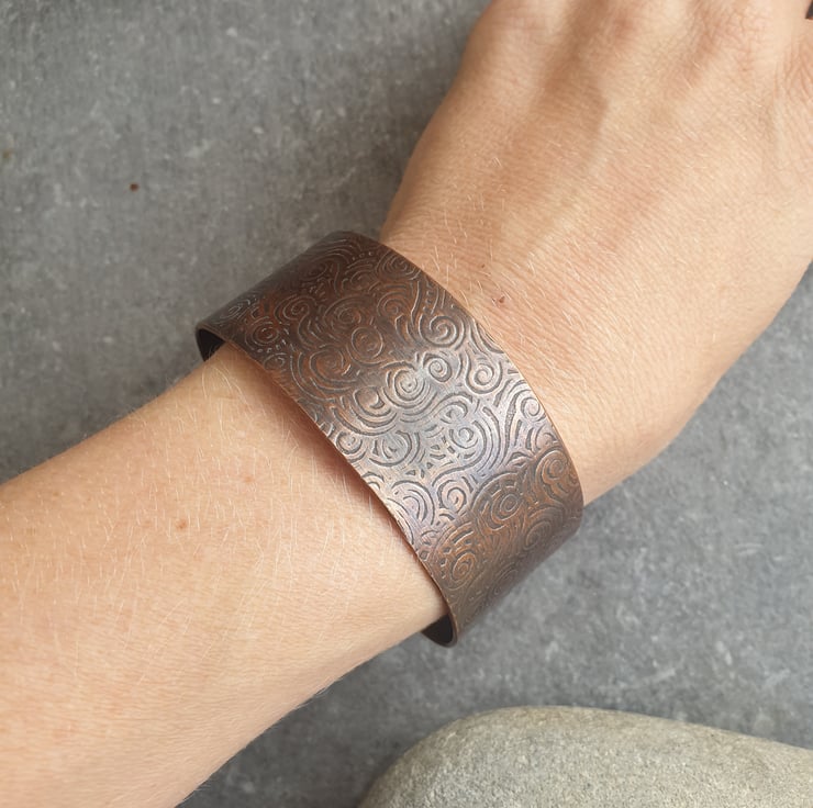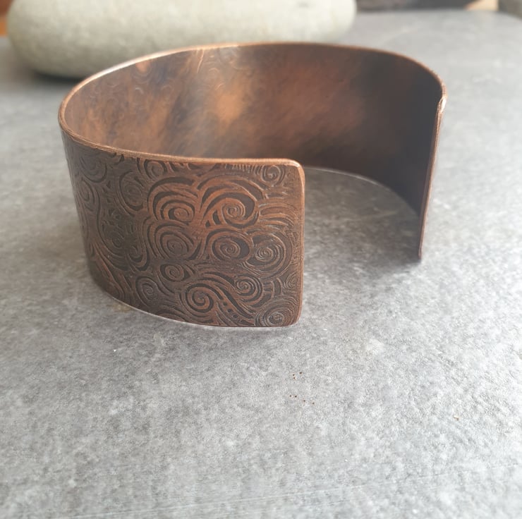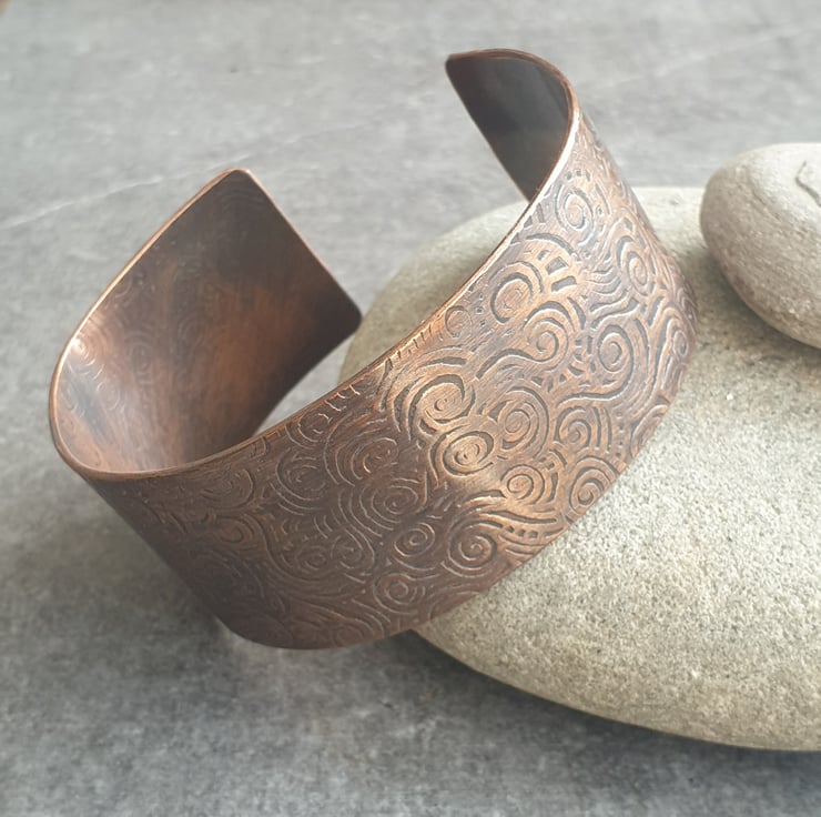 This unusual copper cuff bracelet has been made from solid copper sheet which I've deeply imprinted with a spiral pattern. I've formed it into the cuff shape, oxidised and polished it to a rich deep shine.