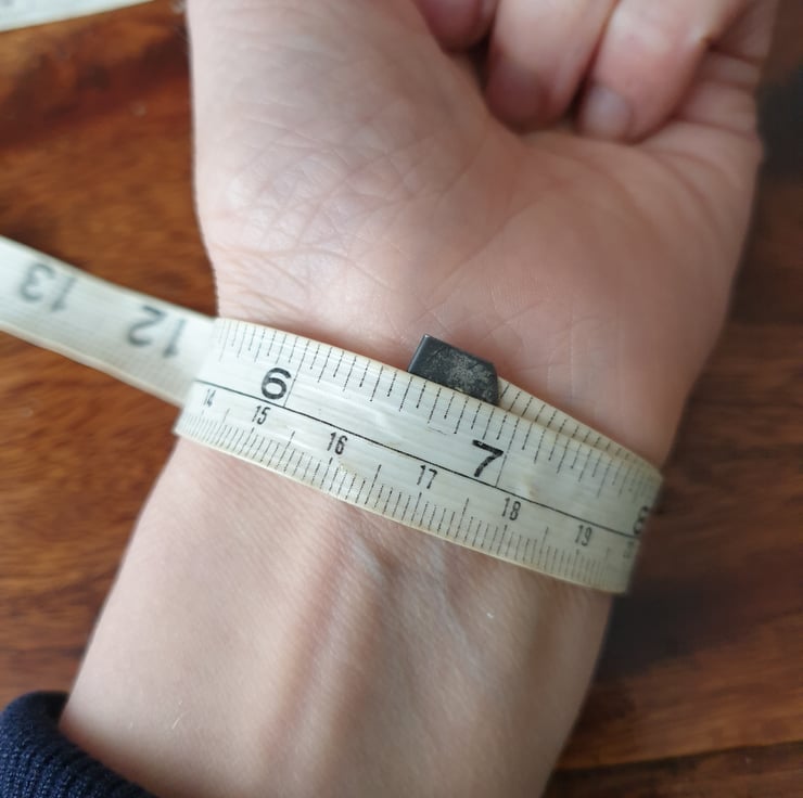 Made to order in your size, please use a tape measure to measure closely around at the point where your hand meets your wrist and then choose the appropriate size from the drop down menu. If you want a cuff that's more loosely fitting then order the next size up. If you're buying as a gift and don't know the wrist measurement the most common size for women is 17cm and 20cm for men. The last picture shows a guide on how to measure your wrist.