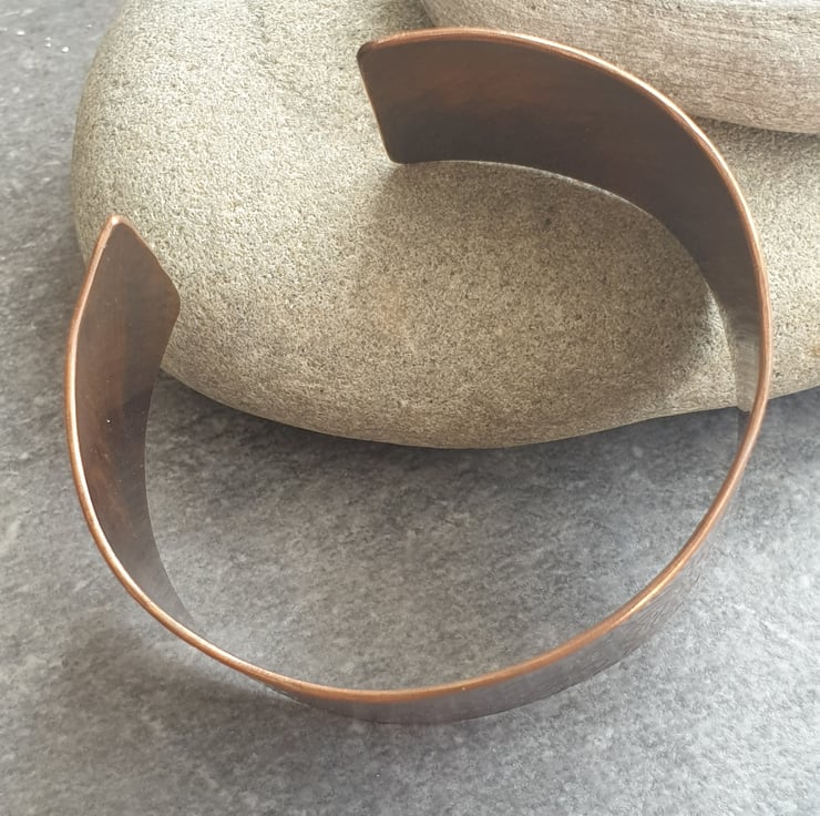 To wear, hold the cuff sideways so it looks like a C shape, slide the opening over the narrowest part of your wrist, then turn it so the top faces up. Please don't pull it apart to put it on as repeated opening and closing will eventually cause the copper to stress weaken and crack.
