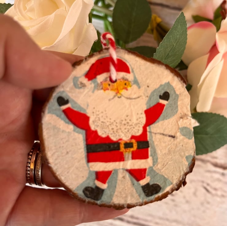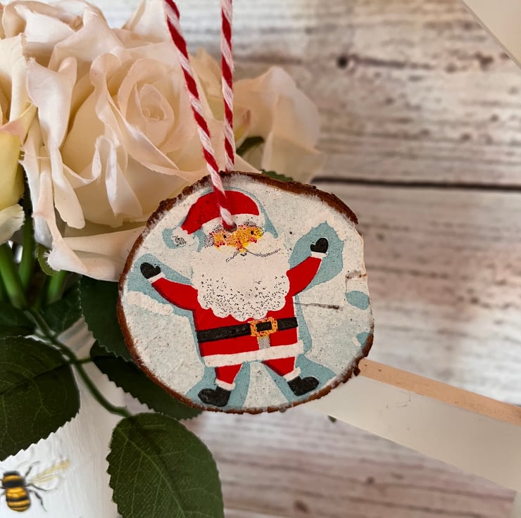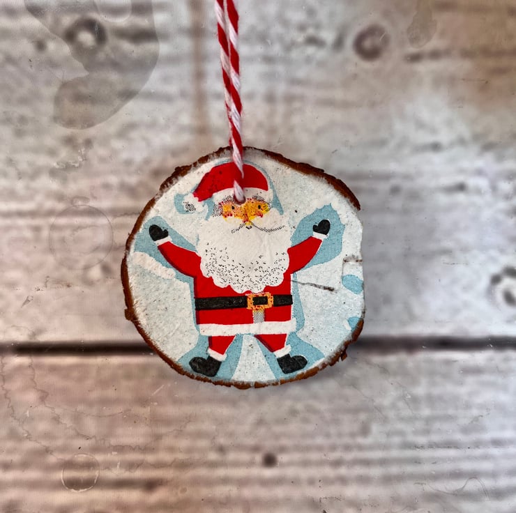 These cute hanging decorations have been made from natural wood slices that have been painted then decoupaged in a Christmas design using napkins.
