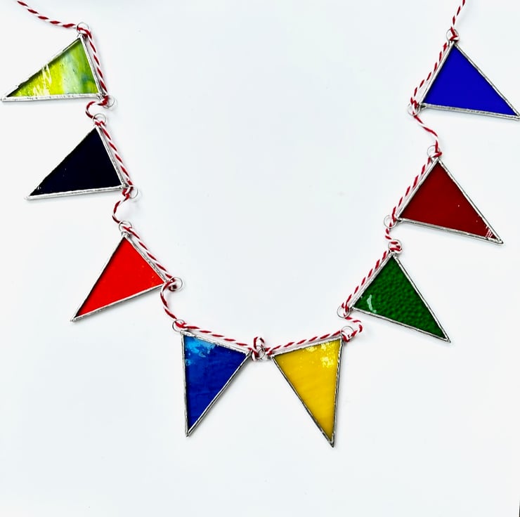 Each piece of glass is cut by hand, so the flags may vary slightly, are then ground to remove any sharp edges, washed and foiled then soldered together. Have attached two rings so the flags can be attached to the string.