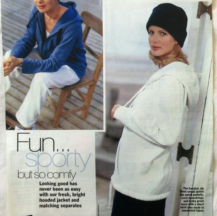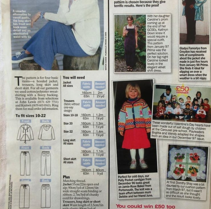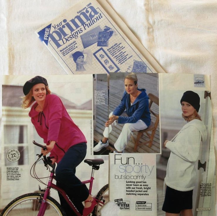 A multi-size sewing pattern for a woman's leisure suit - hooded jacket, trousers, long and short skirt in sizes 10 - 22 (bust 32.5"/83 cm - 44"/112 cm, Prima, February 1999). The zipped jacket has a hood and front pockets, the trousers, long and short skirts all have an elasticated waist and decorative cord. There are templates and instructions for other projects on the pattern sheet.
