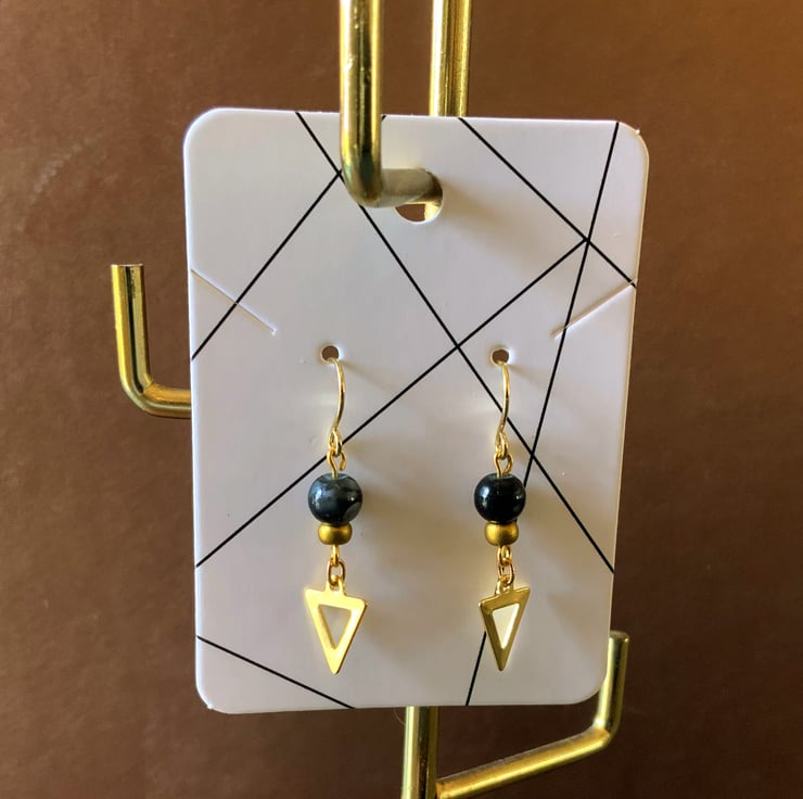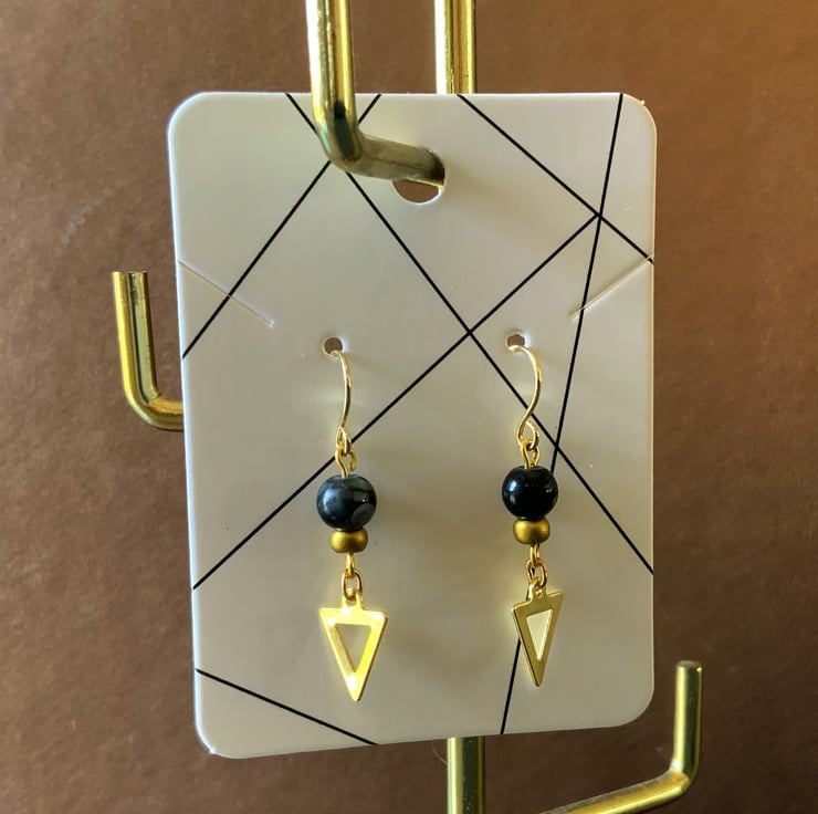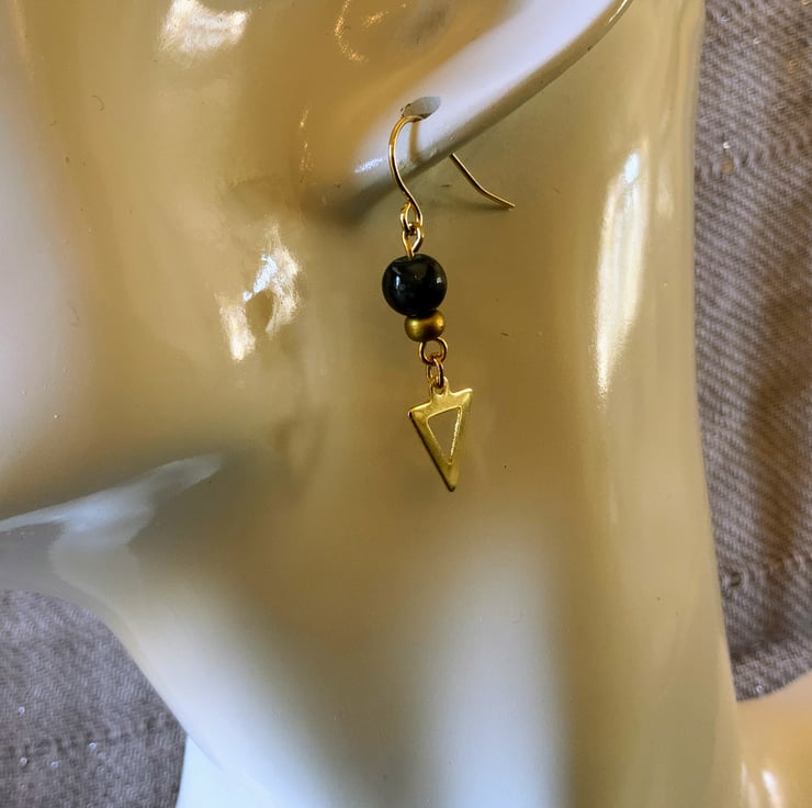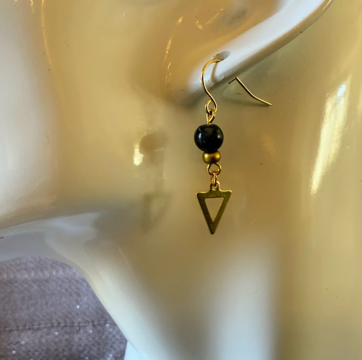 Gold Stainless steel triangle charm earrings featuring black marble beads and old gold mini rochelles.