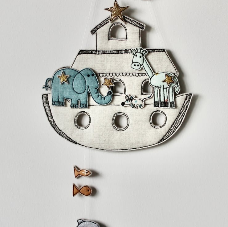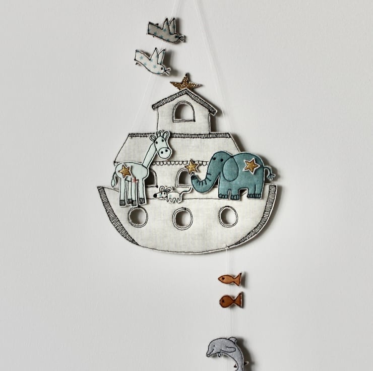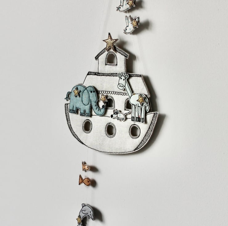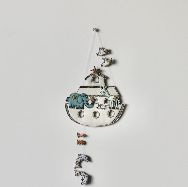 Measuring approximately 15cm by 15cm with the sewn dolphins and fishes suspended approximately 13cm below the ark.