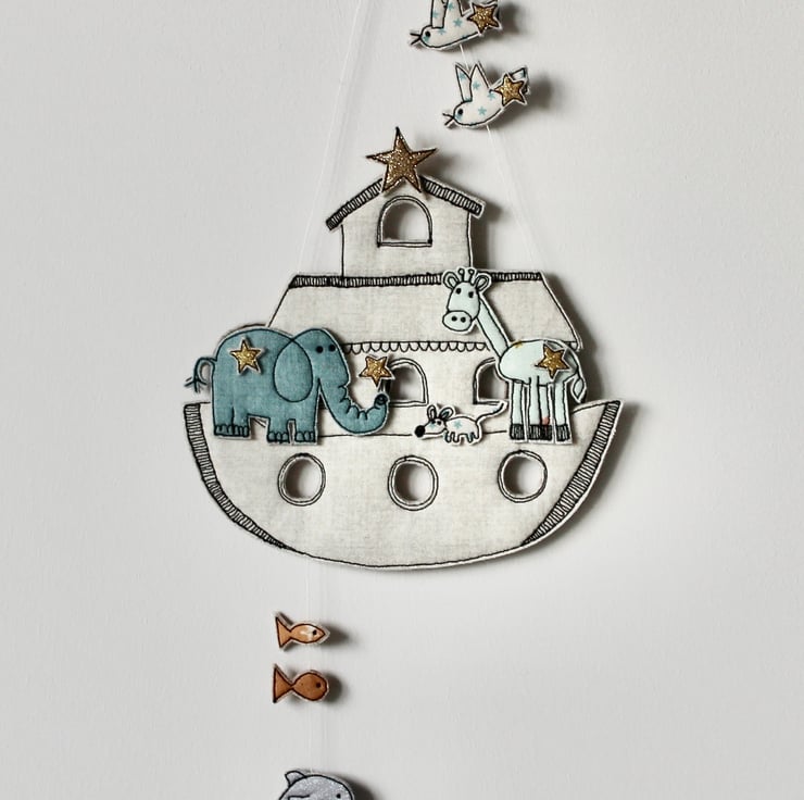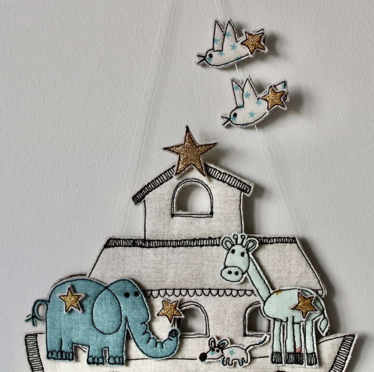 Noah's Ark is created using freehand machine embroidery and multiple layers of cotton cloth, glitter fabric and 100% wool felt. Cut out by hand using very sharp scissors with a linen thread to suspend.