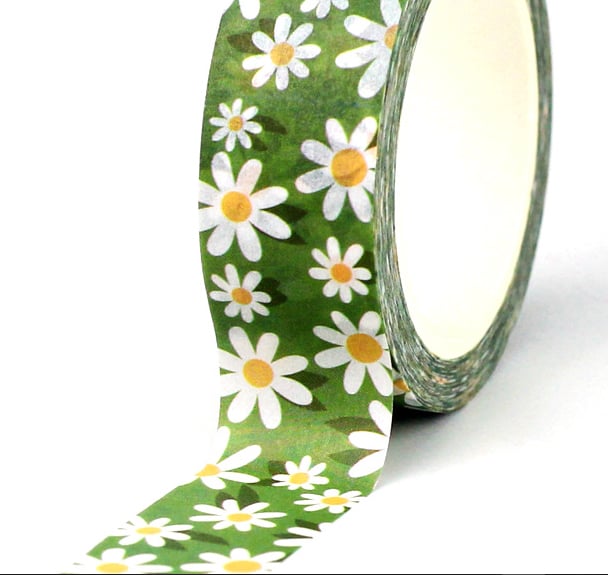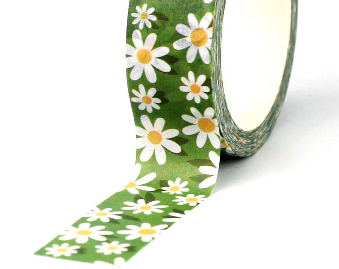 White daisy type blooms with yellow centres in this floral patterned tape, on a green background.