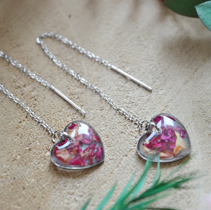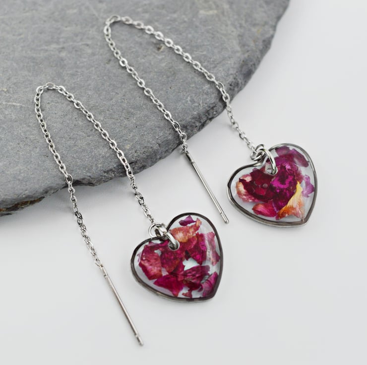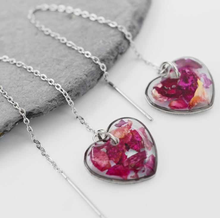 As part of the "Fleur Real Collection" are these floral Threader Earrings made with genuine natural high quality freeze dried Rose Petals, various shades of purple and pink cured within high gloss Resin.