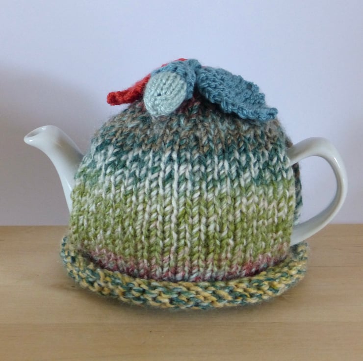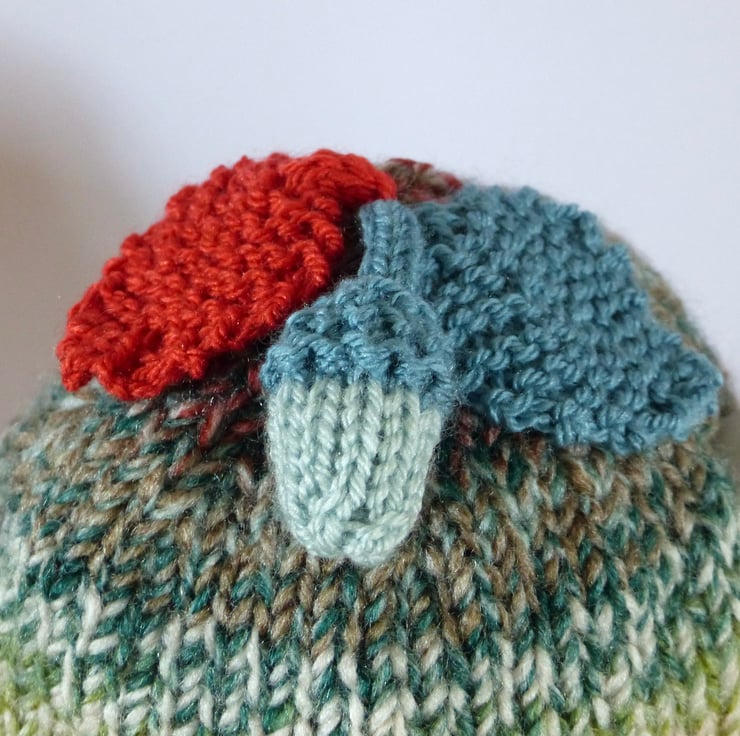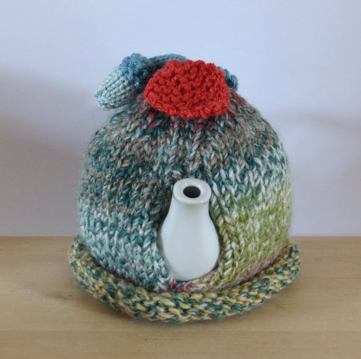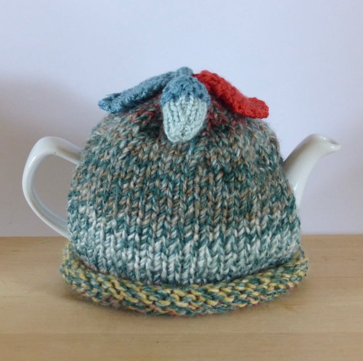 A hand knitted Tea Cosy in a chunky variegated yarn in Greens, Beige and Red. It is decorated on the top with two knitted leaves in Tomato Red and Teal and a knitted Acorn in Teal and Duck Egg. Knitted to fit a standard Two Cup Teapot this cosy has a roll rim and plenty of stretch so should fit a variety of small pots. An ideal gift for a Tea Lover or as a New Home or House Warming gift.