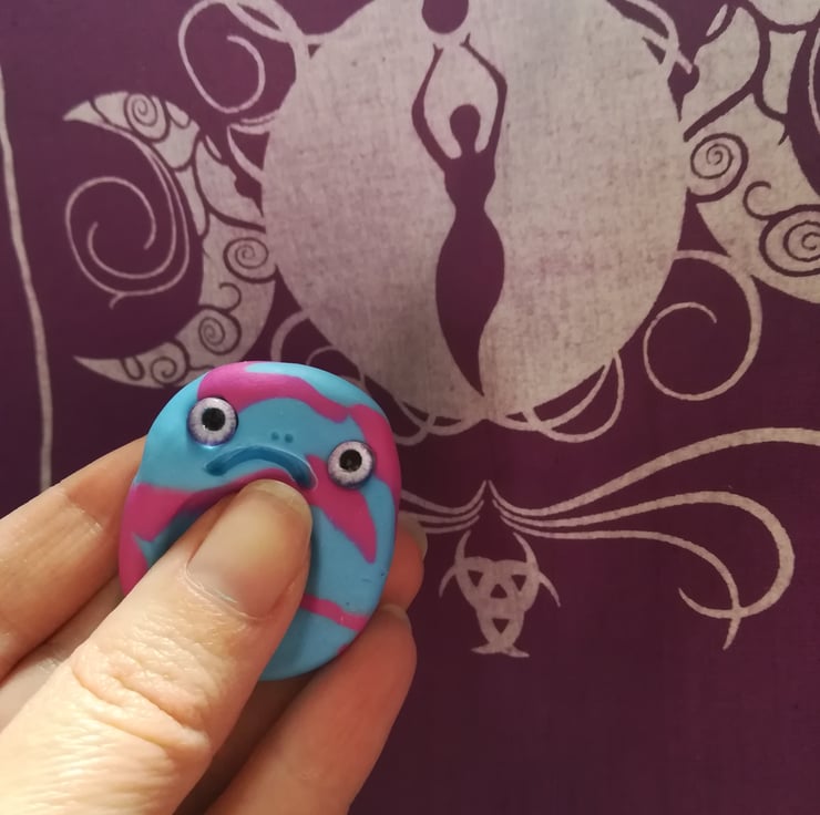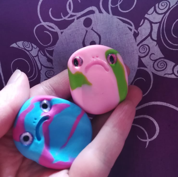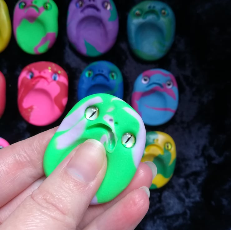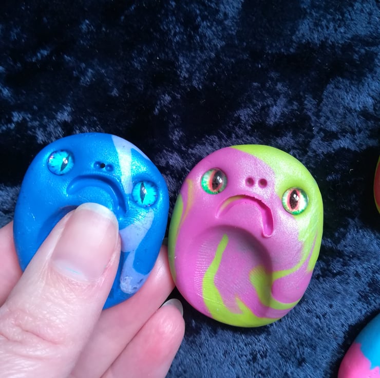 These thumb stones are made using oven bake clay in mottled colours. Some have added glitter or shimmer, and they all have glass eyes and grumpy faces.