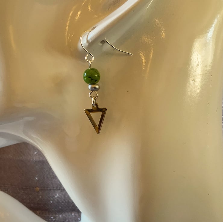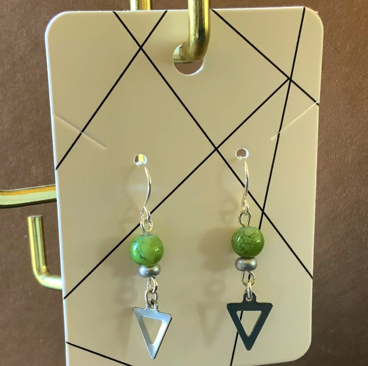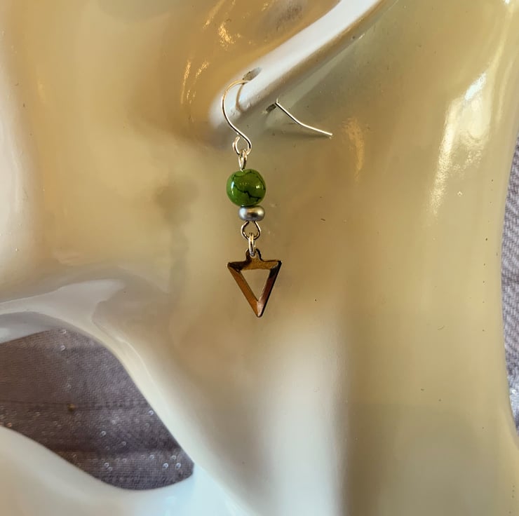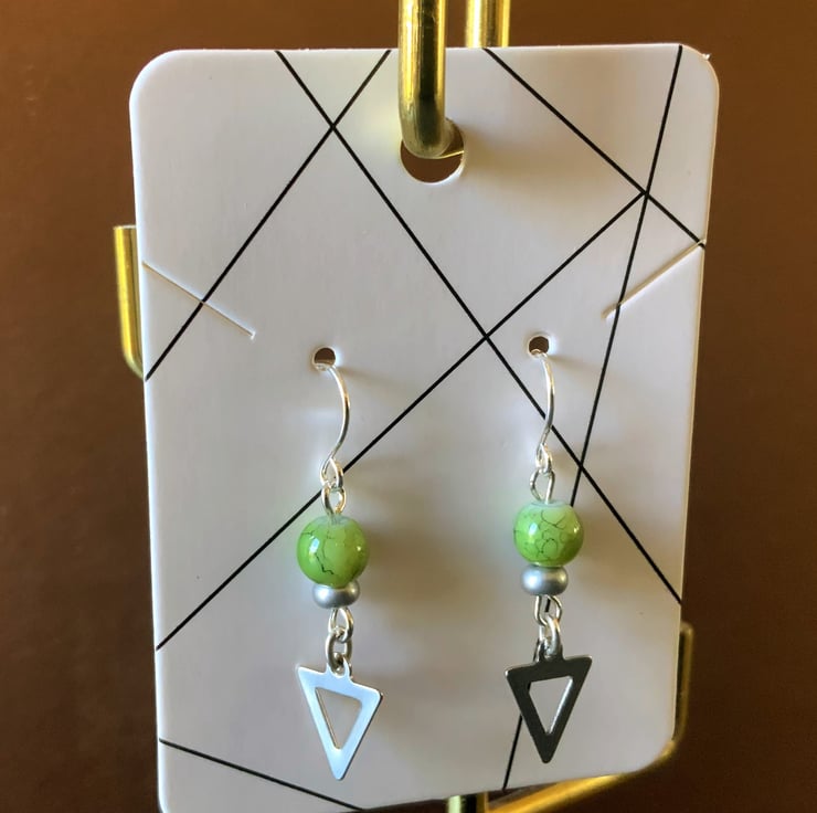 Silver stainless steel triangle charm earrings featuring pale greenglass marble beads and silver mini rochelles.