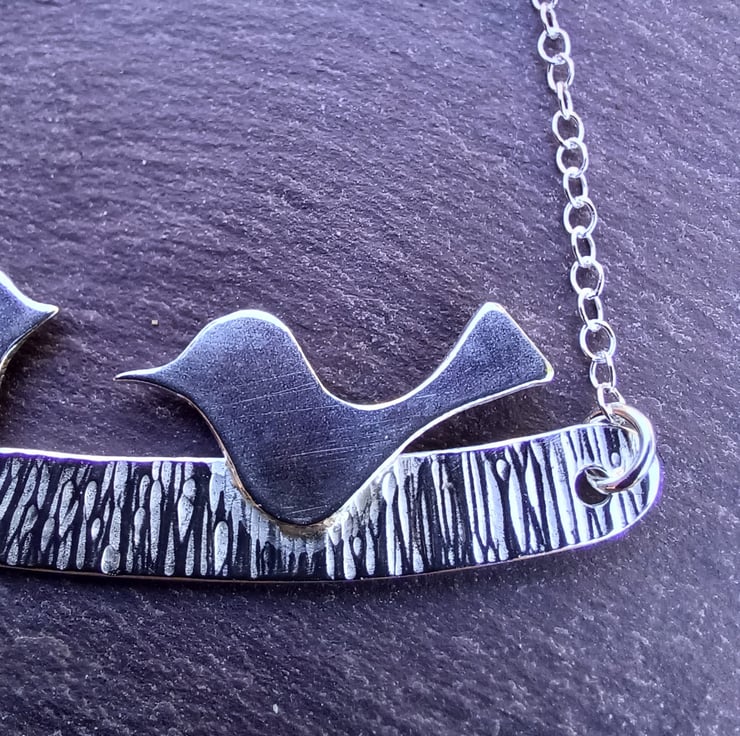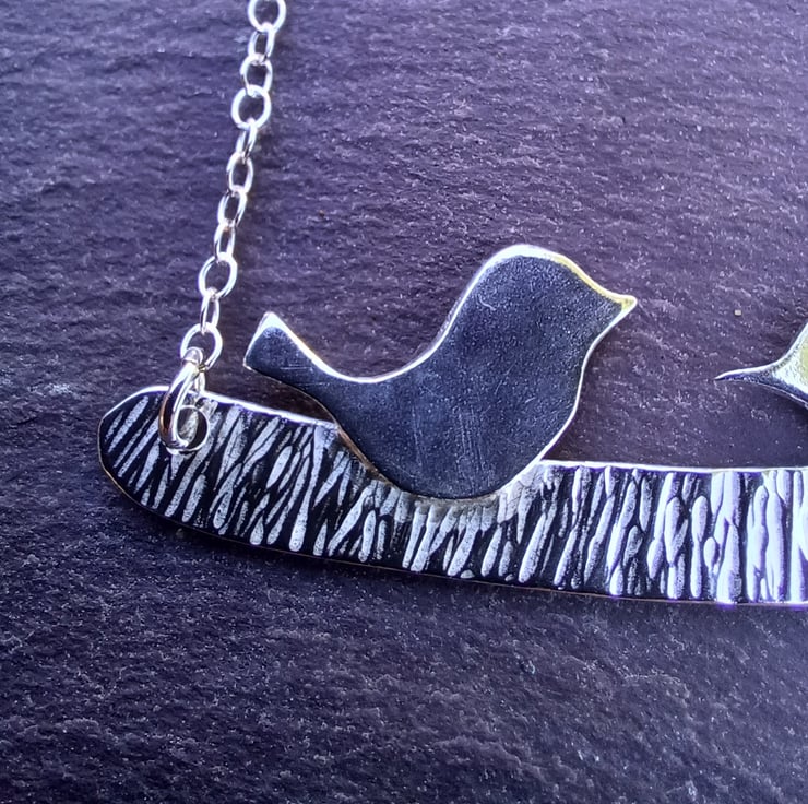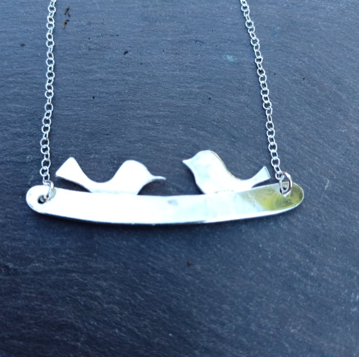 A cute pair of sterling silver birds sitting on a textured sterling silver perch. The perch is 5.5cm long and 0.5cm wide. The birds are 1cm tall and 1.5 - 2cm wide.