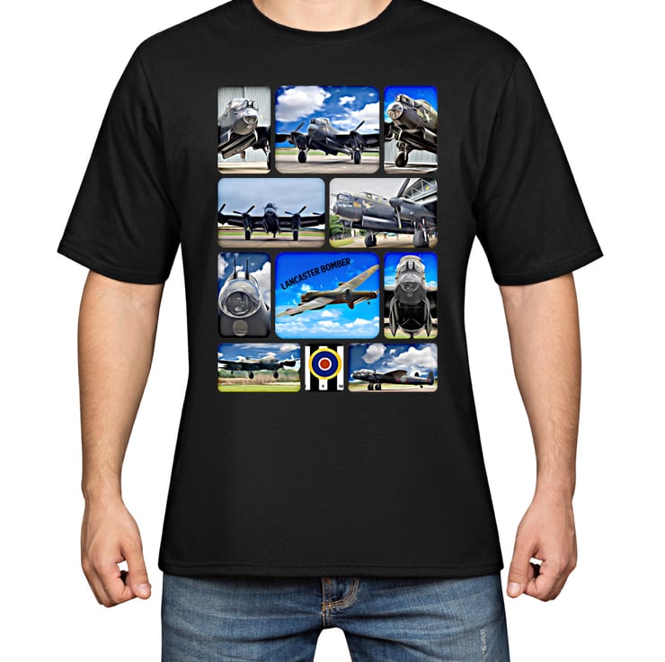 Avro Lancaster Bomber T Shirt Avro Lancaster Bomber T Shirt T Shirt comes in Black, Blue, Grey, Red, Military Green, Choose Your Size Unofficial designed and printed by us Aggies Bags Please Note, See Size Chart, this is a 140gsm Cotton T Shirt, Medium Weight Casual Regular Fit T Shirts Small to 4XL designed by us Aggies Bags