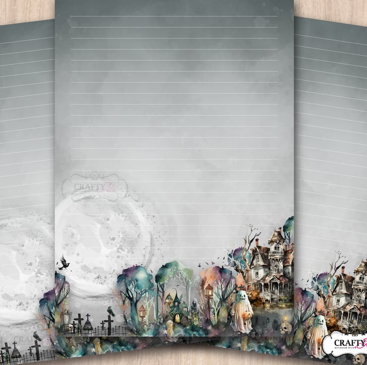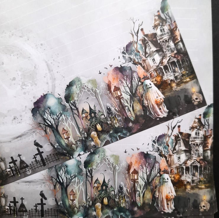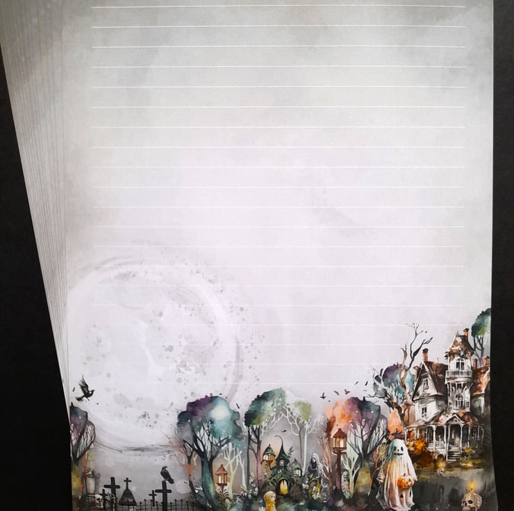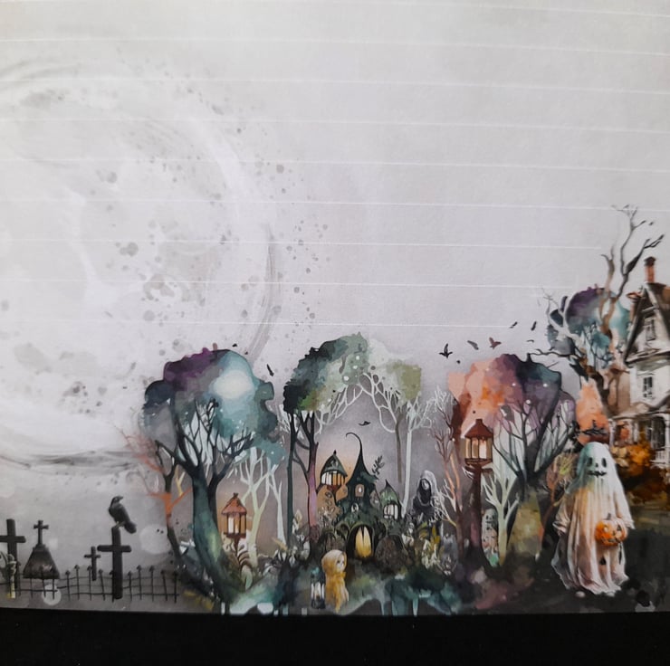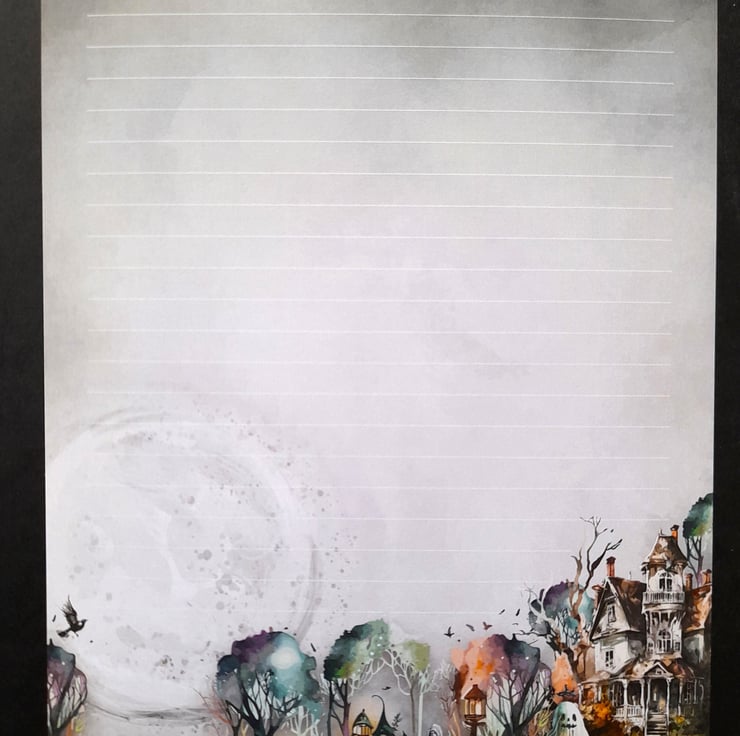 A set of 10 sheets of A5 size handmade letter writing / notepaper set with a creepy haunted woods design.