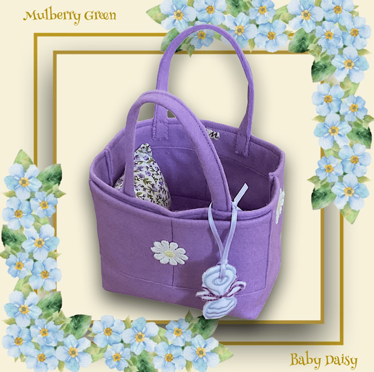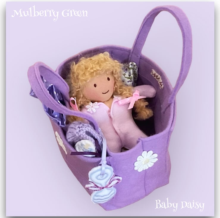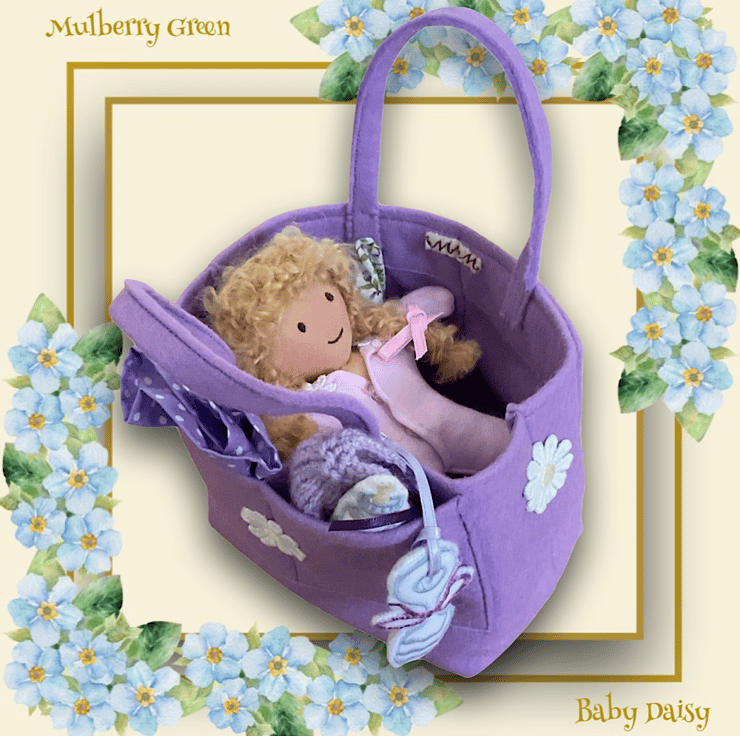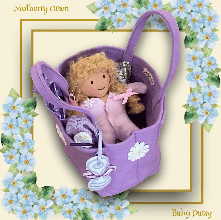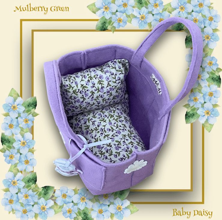 A cute carrycot for baby Daisy. Everything a budding new mini mum needs - the carrycot has four big side pockets to store clothes, nappies, a bottle, a dummy etc. It has a padded mattress covered in cotton fabric, a matching pillow and a little baby toy hanging from the handle. The carrycot is handmade from double stitched felt, decorated with daisies - perfect for taking your baby Daisy on an outing or popping her in for a little nap.