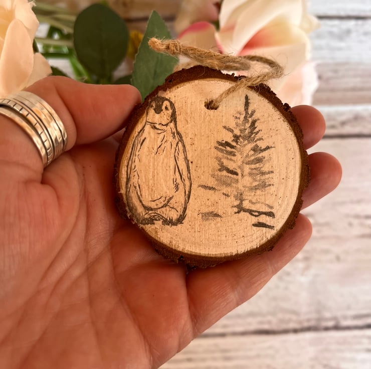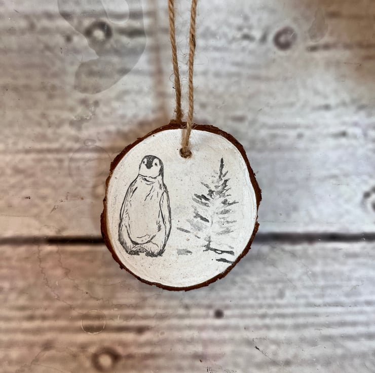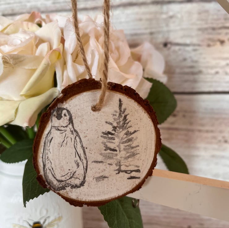 These cute hanging decorations have been made from natural wood slices that have been painted then decoupaged in a Christmas design using napkins.