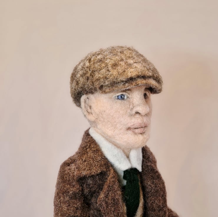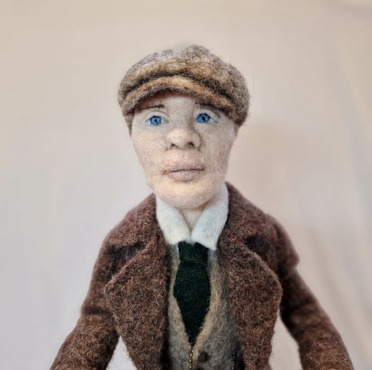 I found this lovely toy tricycle at an antiques fair and thought it would be perfect for a Furzie figure to ride. The figure was going to be cycling with purpose and it seemed a peak cap and jacket would suit. Then I decided that Peaky Blinder Cillian Murphy's face would be fun to work on!