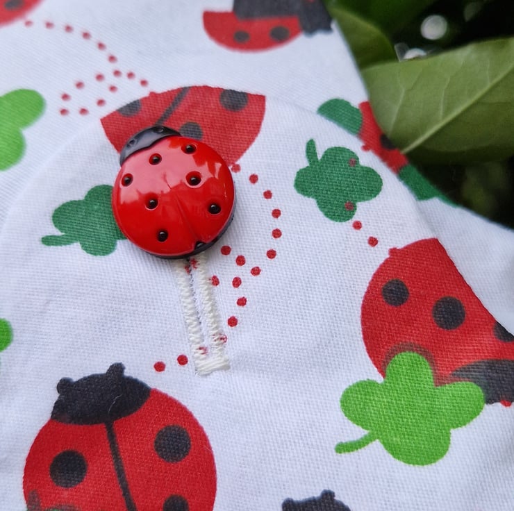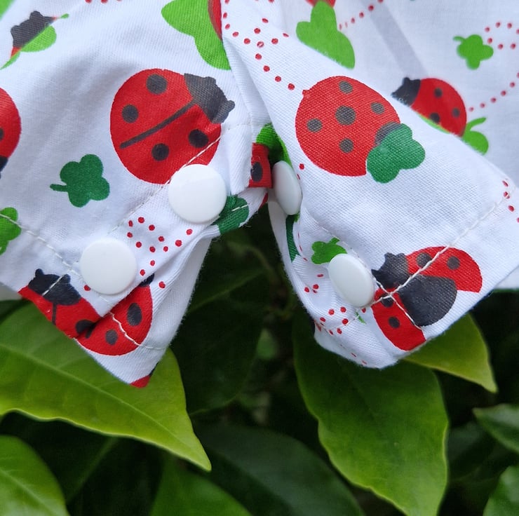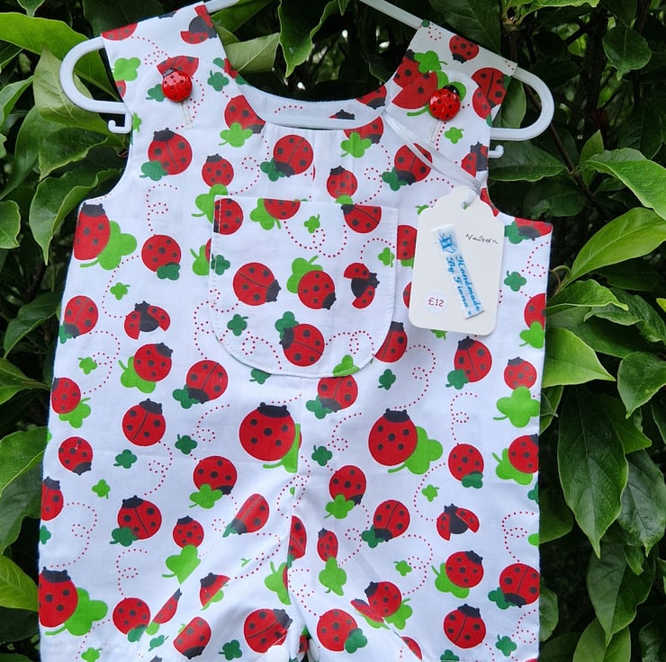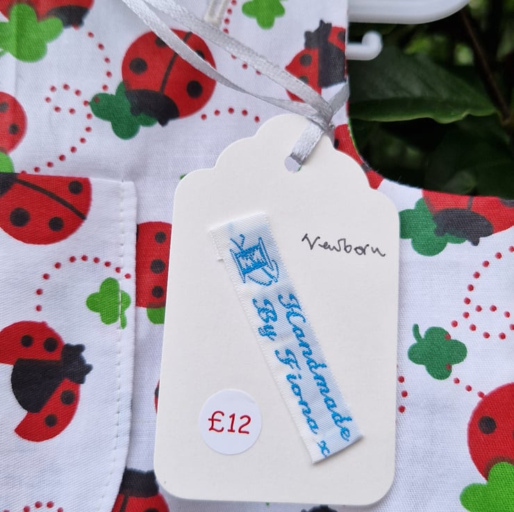 Age Newborn approx, pair of white cotton roomy rompers with a print of mixed sized ladybirds and clover leaves and a centre feature chest patch pocket detail, with plastic ladybird shaped buttons and white poppers at the gusset for easy opening for nappy changes.