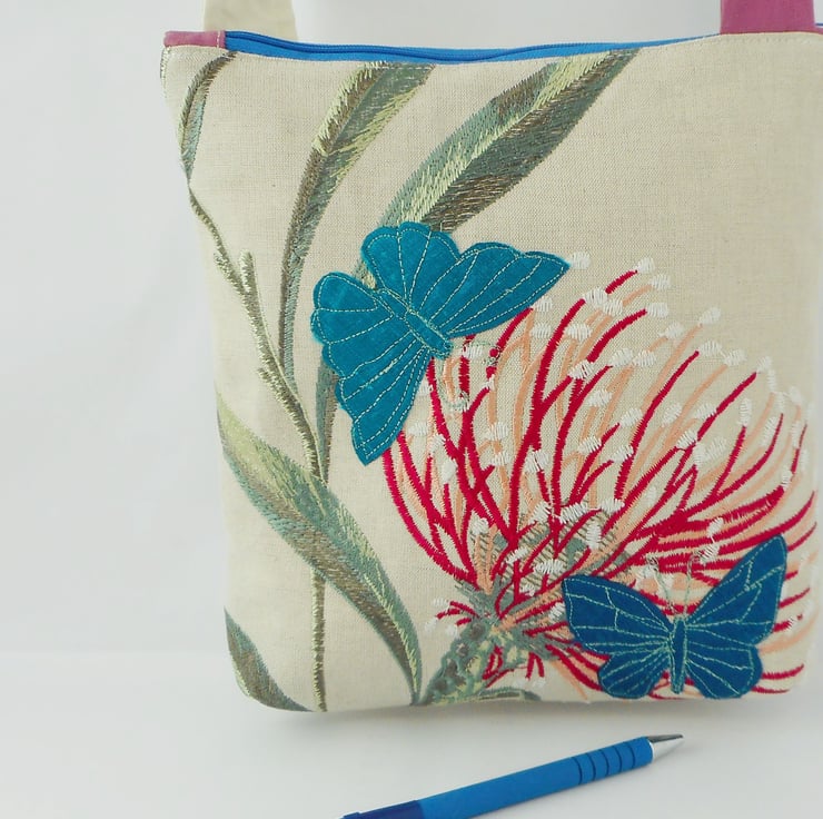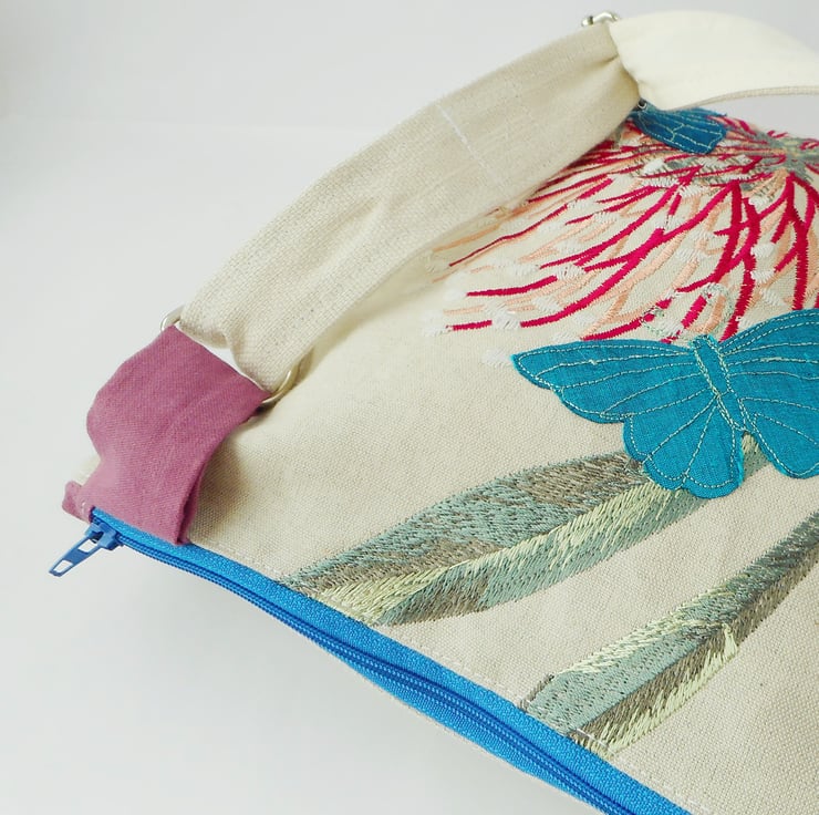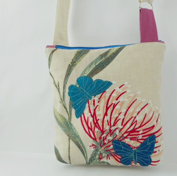 Linen and silk crossbody bag with zipped fastening and butterflies