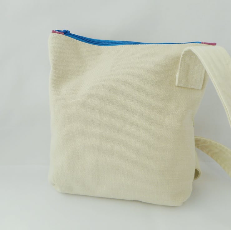 The top opening of the bag is zipped, and the bag is fully lined with cream polycotton.