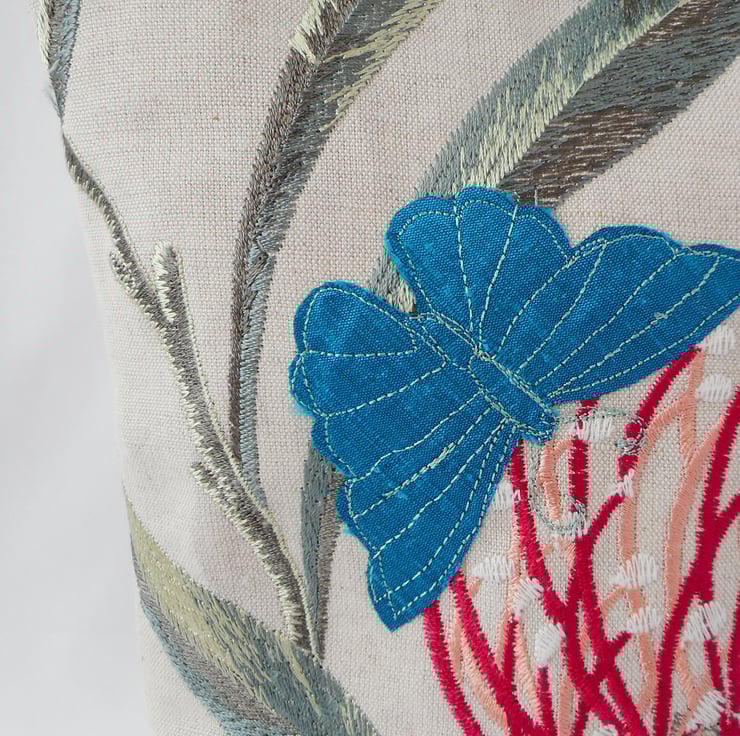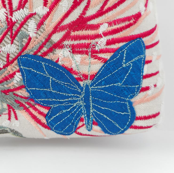 Silk butterflies have been appliquéd and then machine embroidered using the freehand technique.