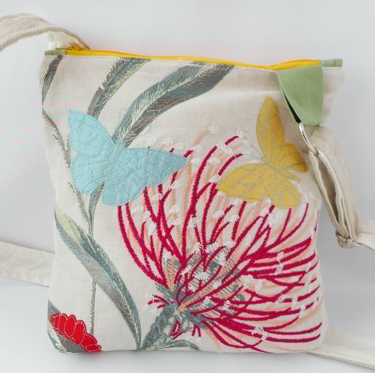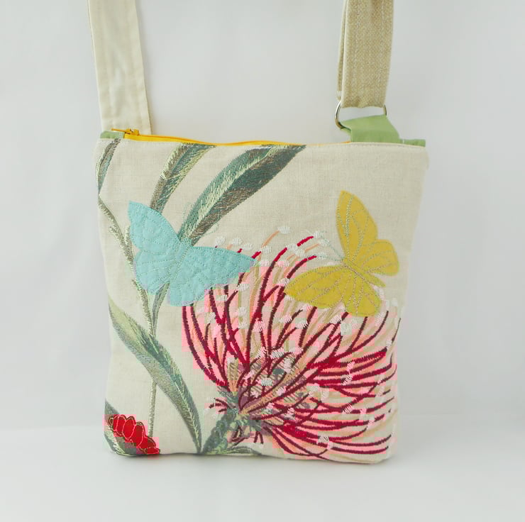 Mariposa is a small to medium sized zipped cross body bag made from luxury interiors fabrics in embroidered linen and silk.