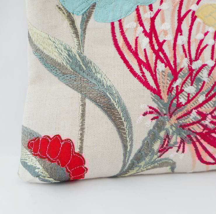 The front fabric is a woven linen with embroidered flowers and leaves. The background linen is a soft neutral beige, whilst the flowers are shades of pink.