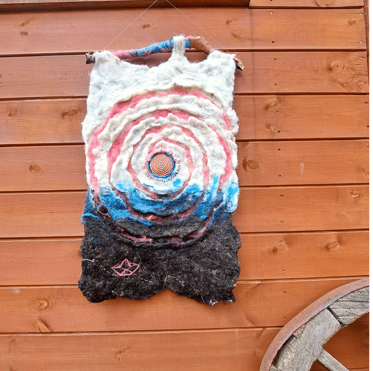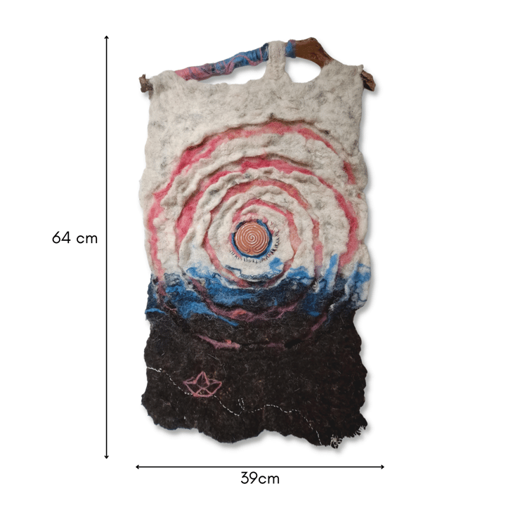 Felted wool using a wet-felting technique with needle felted and hand-stitched elements. driftwood dowel and hand-carved terracotta labyrinth.