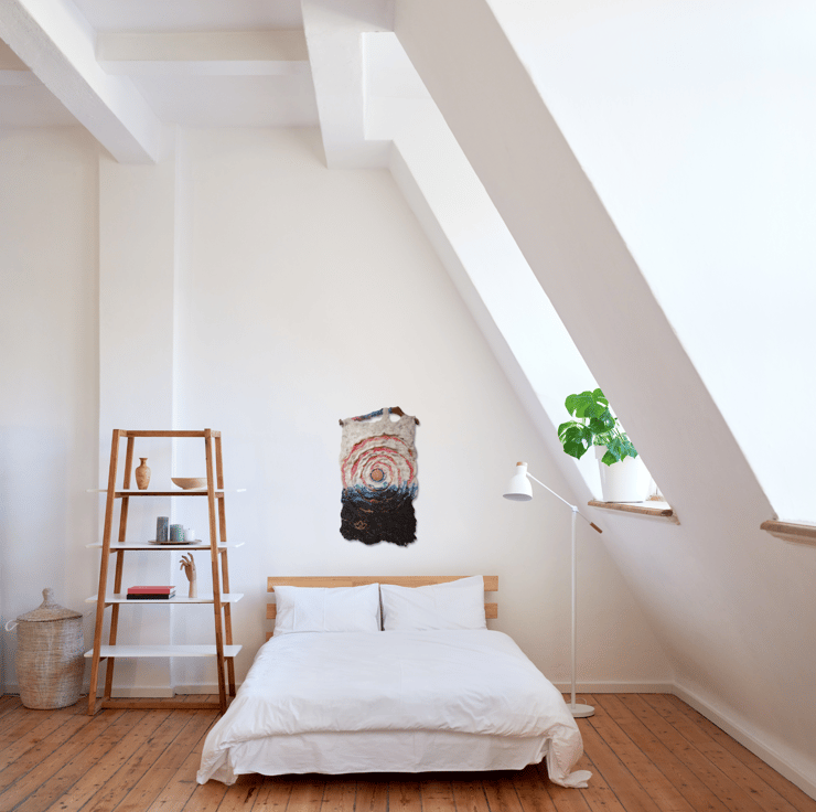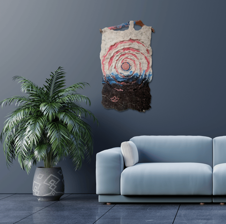 Felted and hand stitched wall hanging featuring a terracotta labyrinth