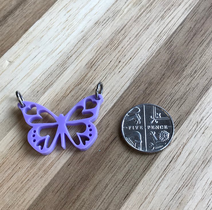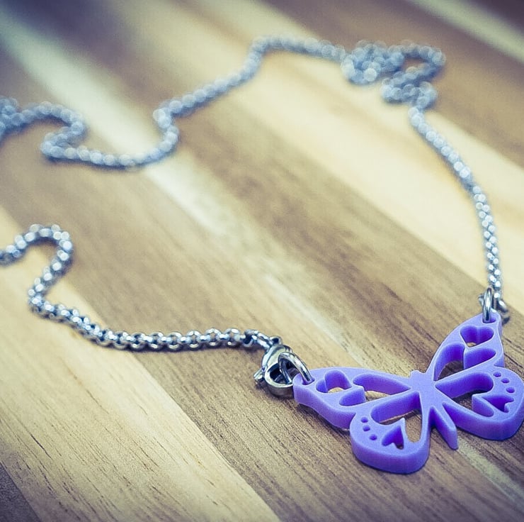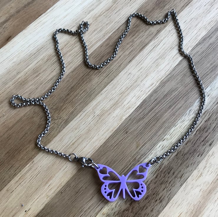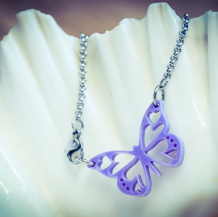 Each necklace is made from a Lilac colour 3cmx2cm, 3mm thick laser cut Acrylic Butterfly charm. It is finished with Stainless Steel jump rings and a 18inch, 2.5x1mm Stainless Steel Rolo Chain with Stainless Steel Lobster Claw Clasp. This chain can be made in different lengths. If you would like a different length chain please send me a message to discuss. Longer length chains may incur additional costs. Perfume should not be sprayed directly onto your items as it may damage them.