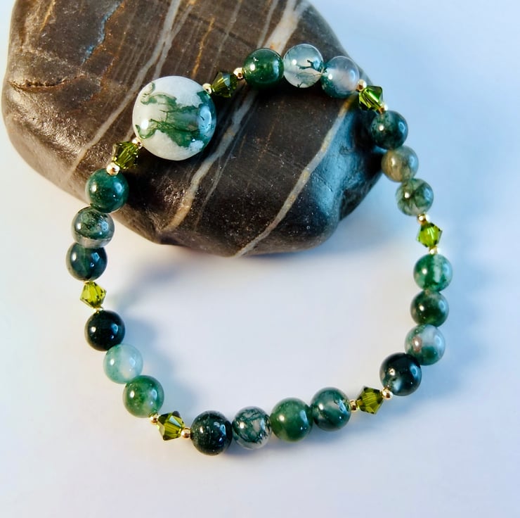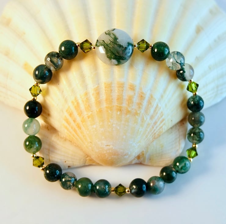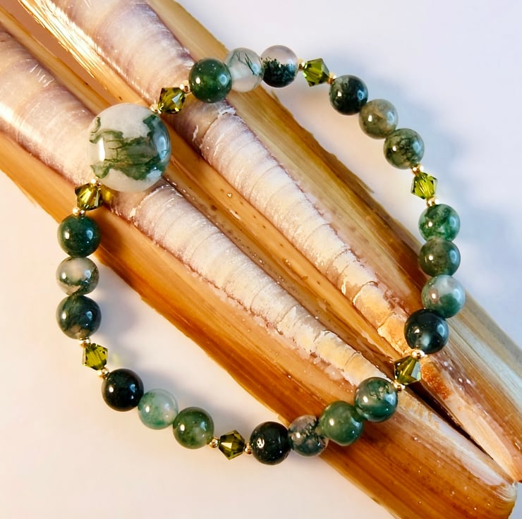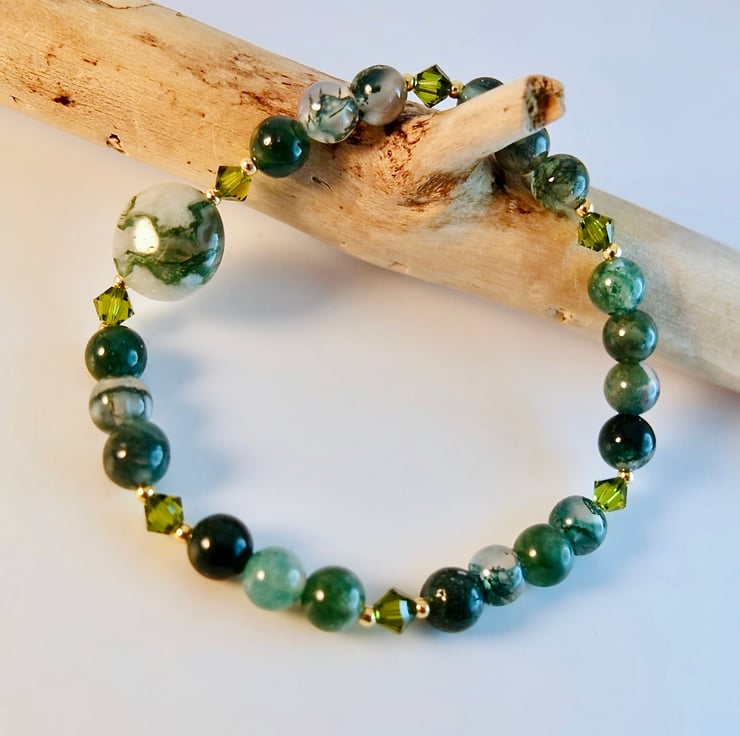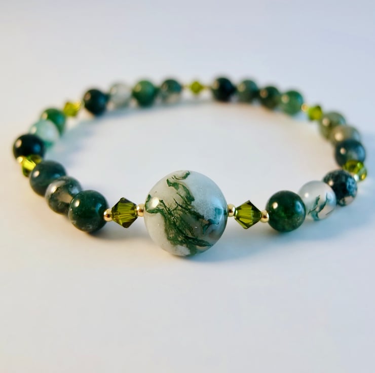 A beautiful Moss Agate bracelet featuring a 12mm flat Moss Agate coin, flanked by Swarovski 4mm 'olivine' bicones highlighted with 2mm gold vermeil, and 4mm round Moss Agate beads.
