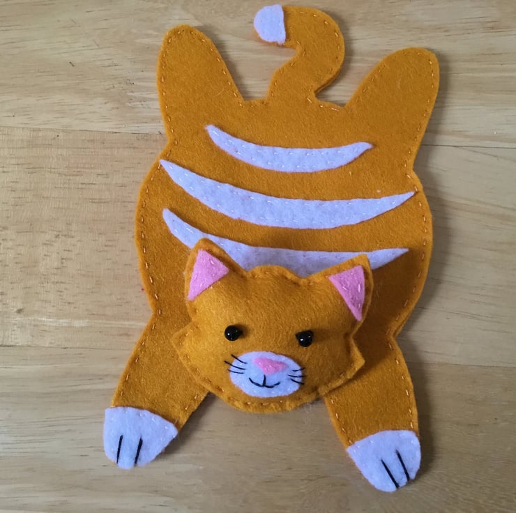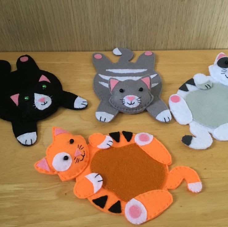 Hand made felt cat mug mat. Ideal for picnics and alfresco dining, great small gifts for work colleagues or any cat lover. Choose your favourite colour.
