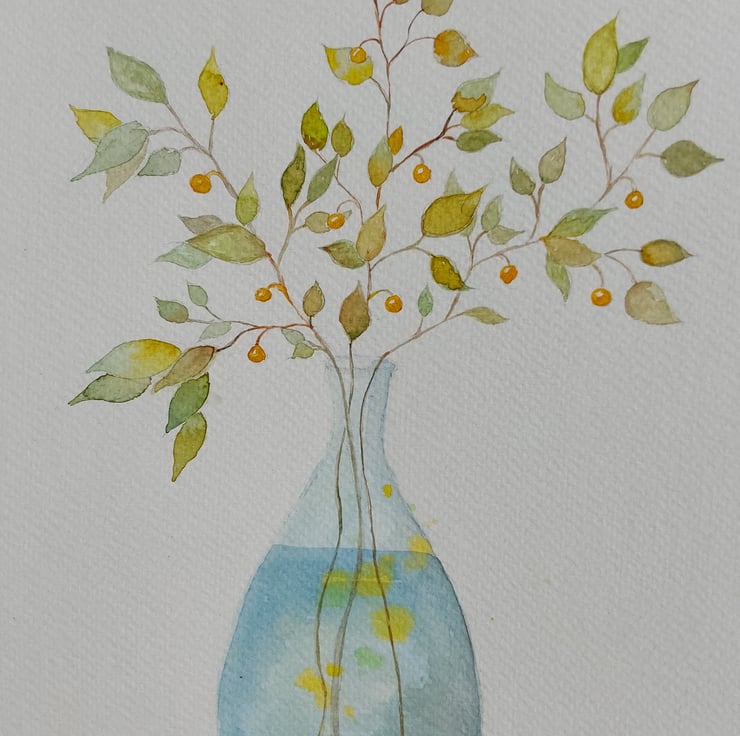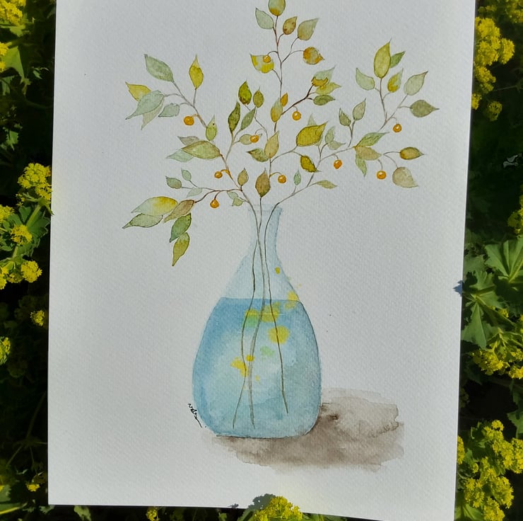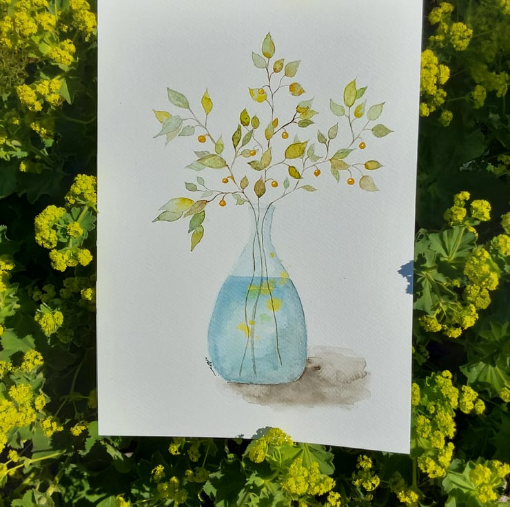 An original watercolour painting of branches of leaves with golden berries sitting in a glass vase.