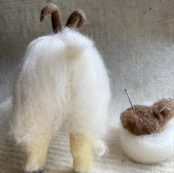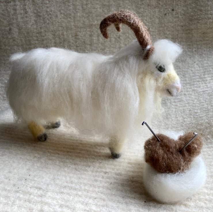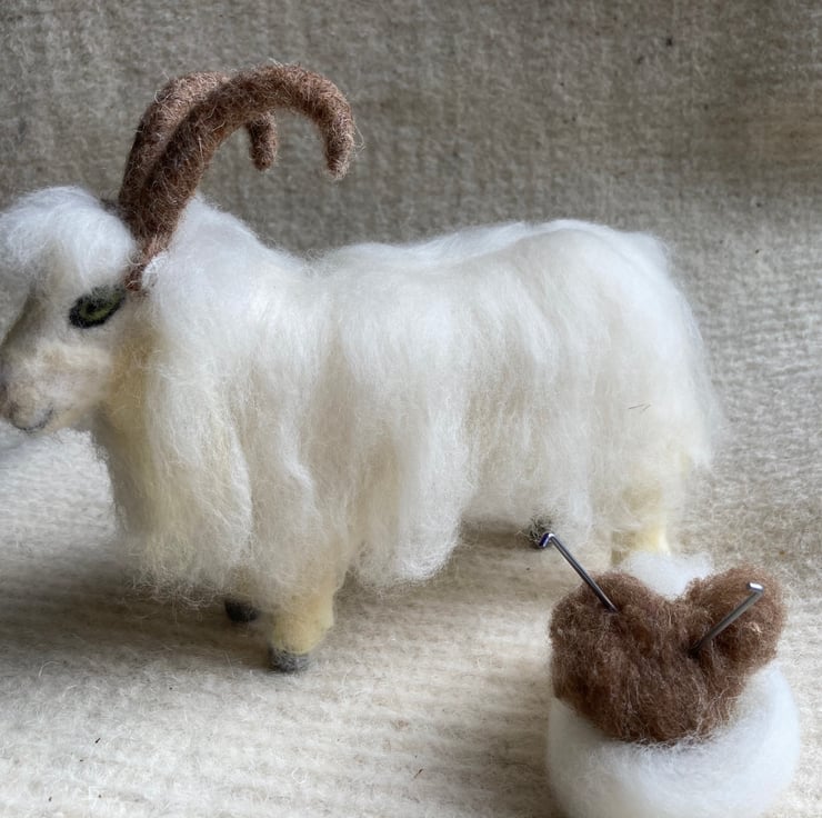 This goat is modelled on the Great Orme Goats who kept us all entertained during lockdown with their regular visits to Llandudno. They are Kashmiri Goats and descend from a pair that were gifted to Queen Victoria. Made from good quality wool and Merino. He is made using a wire armature and his woolly horns are stiffened for added realism. If you love goats and want a good quality unique wool sculpture then he is the one for you!
