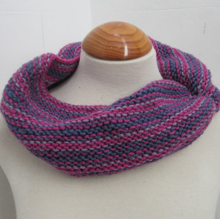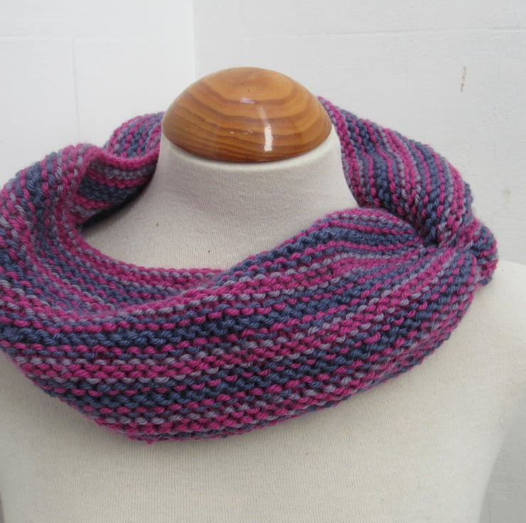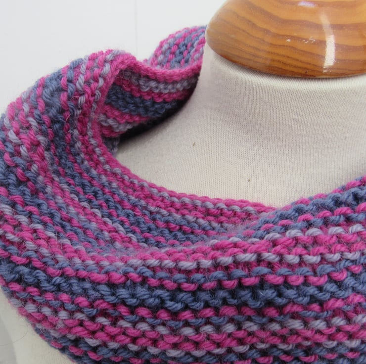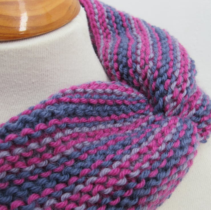 Handknit in shades of cherry pink, purple and lilac this is a wonderful way to keep your neck warm this winter.