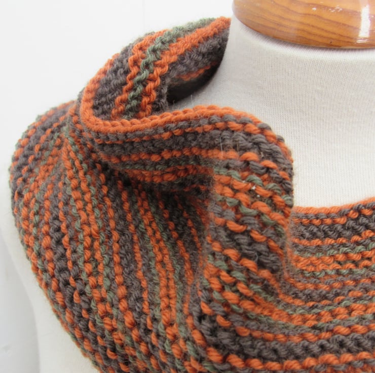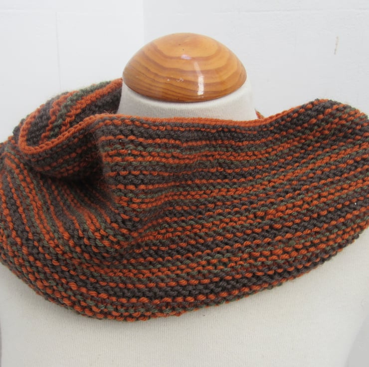 Handknit in shades of dark brown, orange and forest green this is a wonderful way to keep your neck warm this winter.