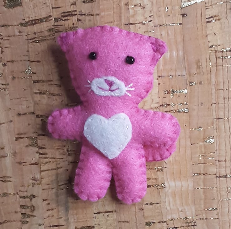 The main colours of the cat are pink and white. The eyes are made from black seed beads. Mouth & nose are stitched in pink thread. The whiskers are stitched in white thread.