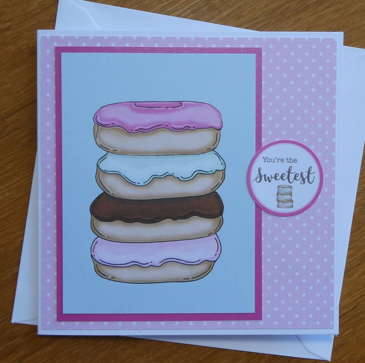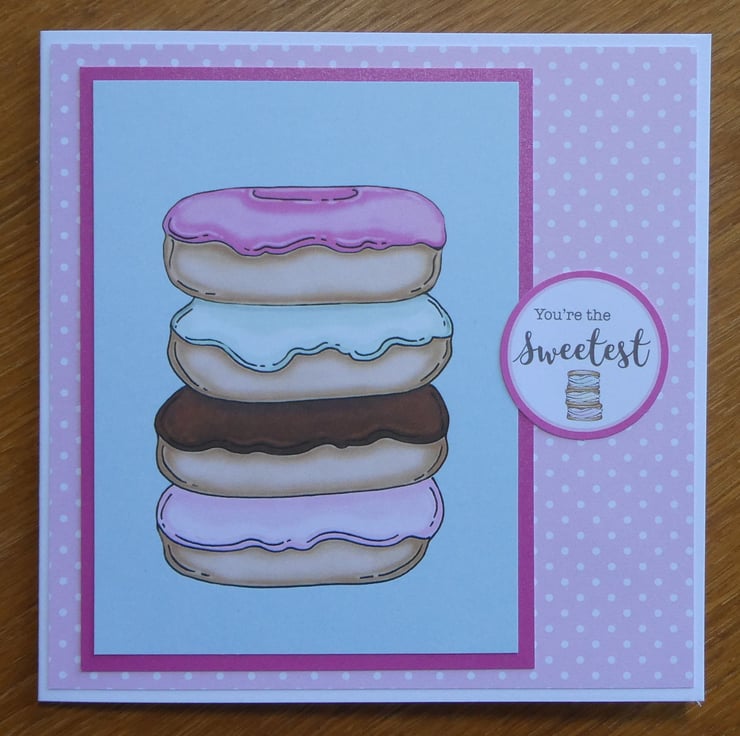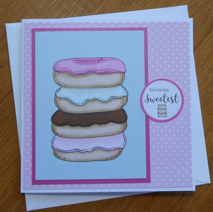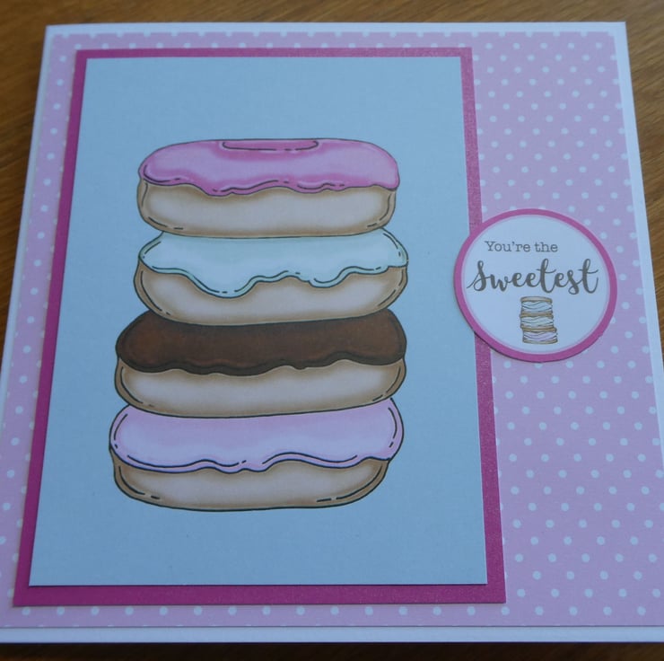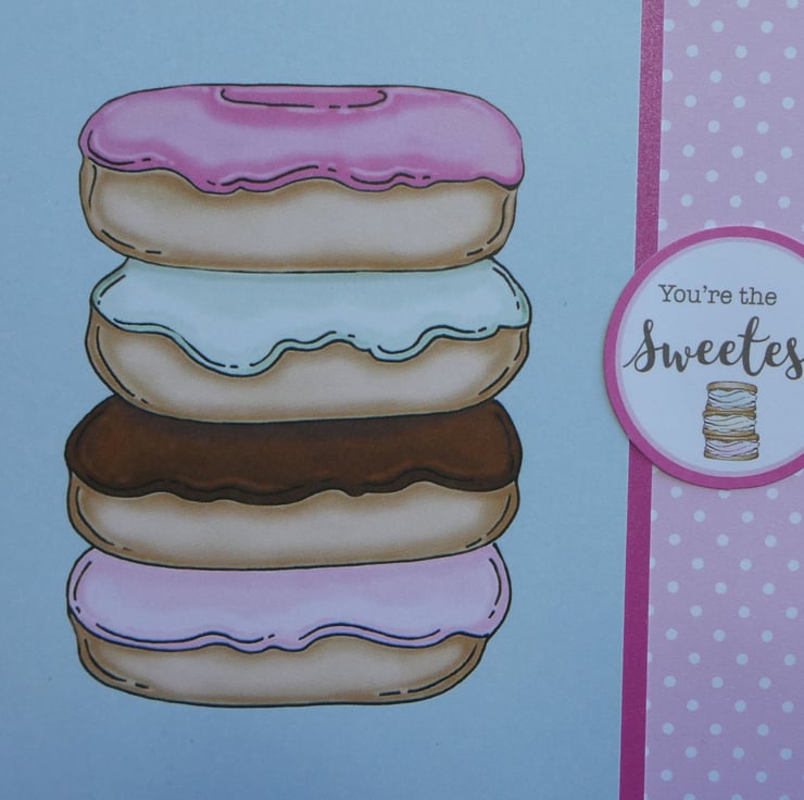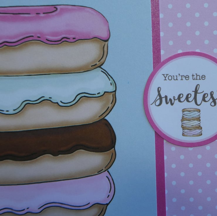 With a stack of iced donuts and the message You're the Sweetest', this card would be lovely to send for as a Birthday or a Thank You card.