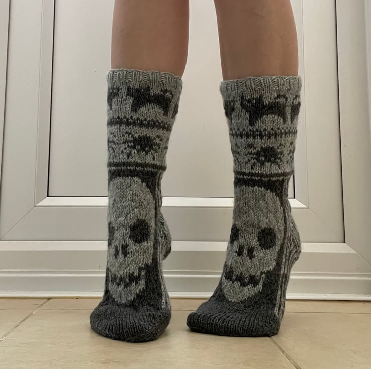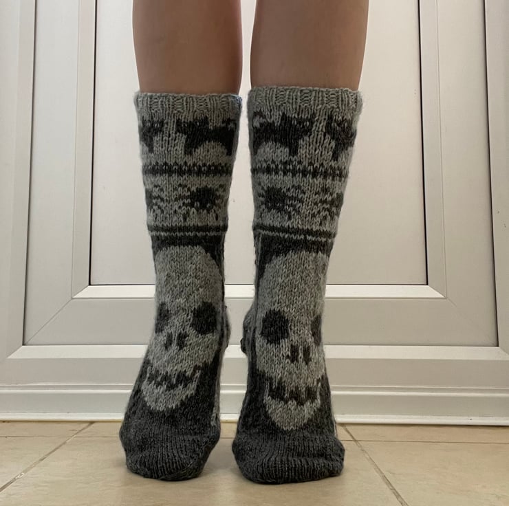 Hand knit grey wool socks halloween skulls nordic winter