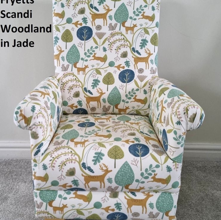 This is a sturdy, handcrafted childrens chair, which has been made by myself, a professional upholsterer with over 32 years experience, using Fryetts Scandi Animals Jade fabric.