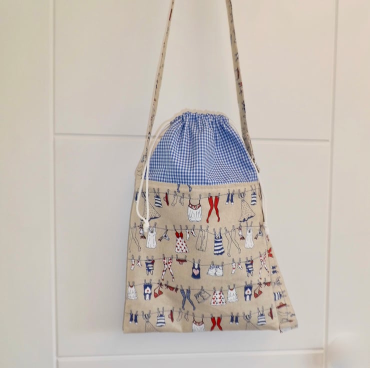 The fabric is a canvas style and it is fully lined with a sturdy plain dark green fabric. At the top is a clever drawstring insert of blue gingham which opens and closes easily with white piping cord to give easy access to your pegs.