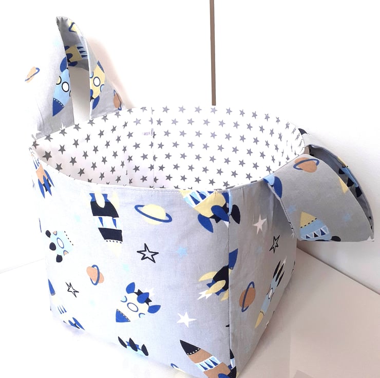 Set of two storage boxes for childs room, in space themed fabric, with handles. Large box is 8" (20cm) square, medium box is 6.5" (16.5cm) square. Sold as set of 2.
