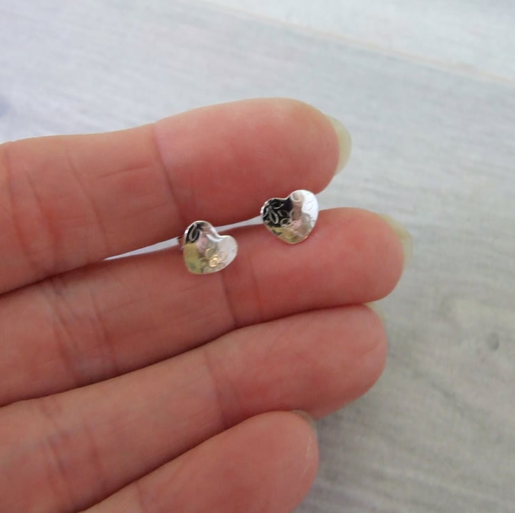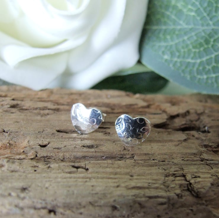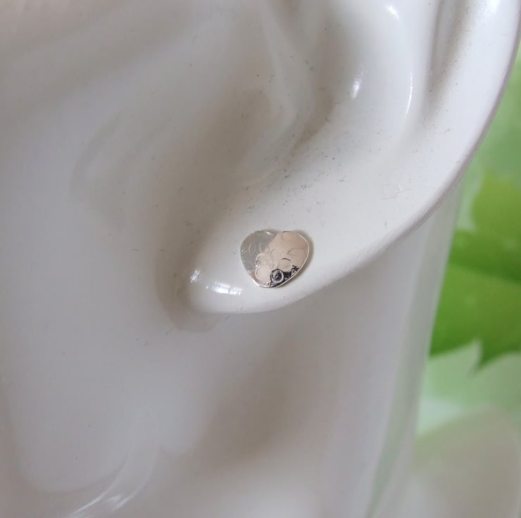 The small studs have been created from recycled sterling silver sheet that I have cut into an small heart and textured with a floral pattern. Soldered to regular .925 sterling silver ear posts with butterfly backs and burnished to a shine. Lightweight earrings.