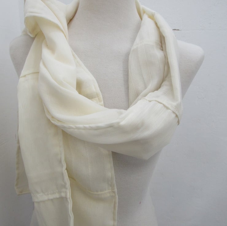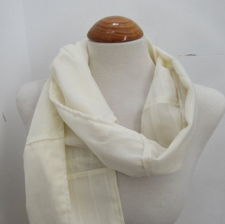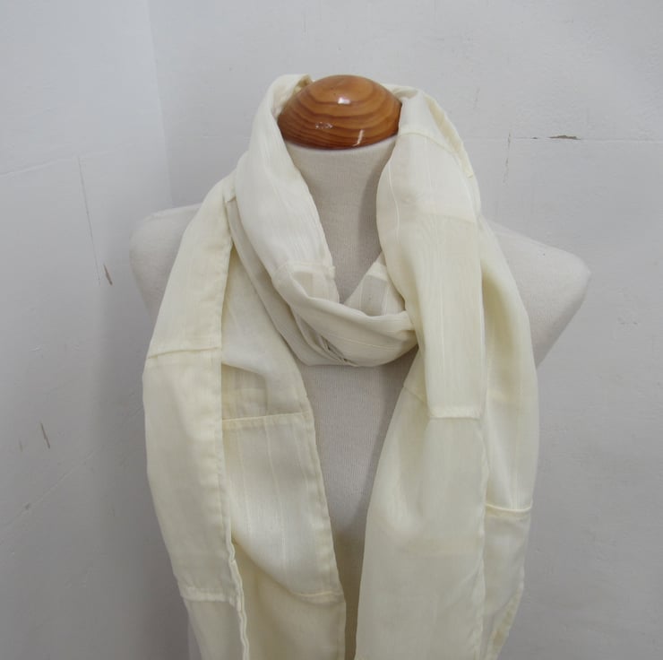 A long, double sided patchwork scarf fashioned from lightweight polyester curtain samples, in shades of cream and ivory.