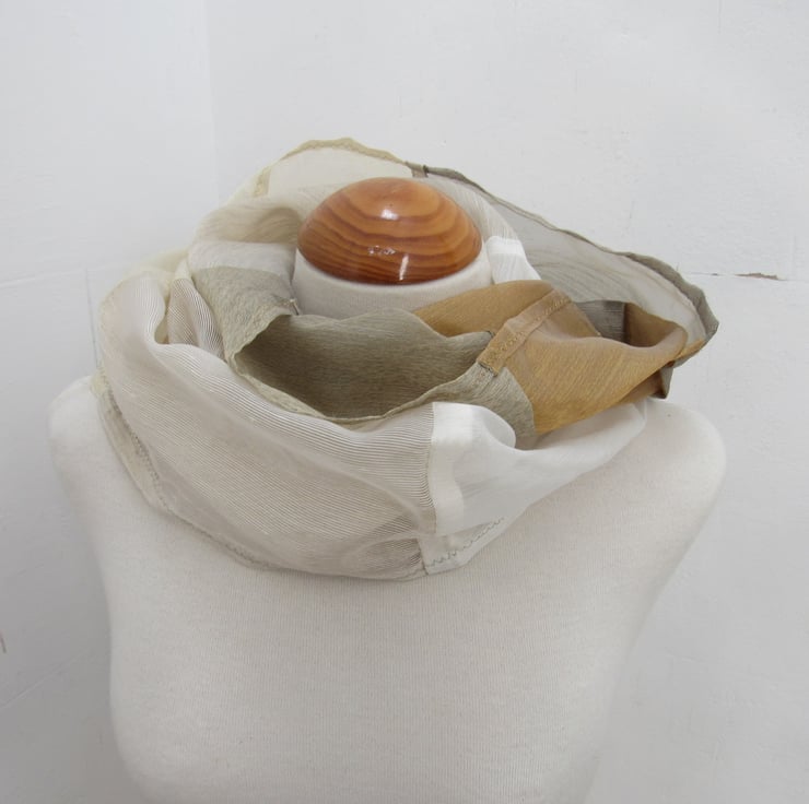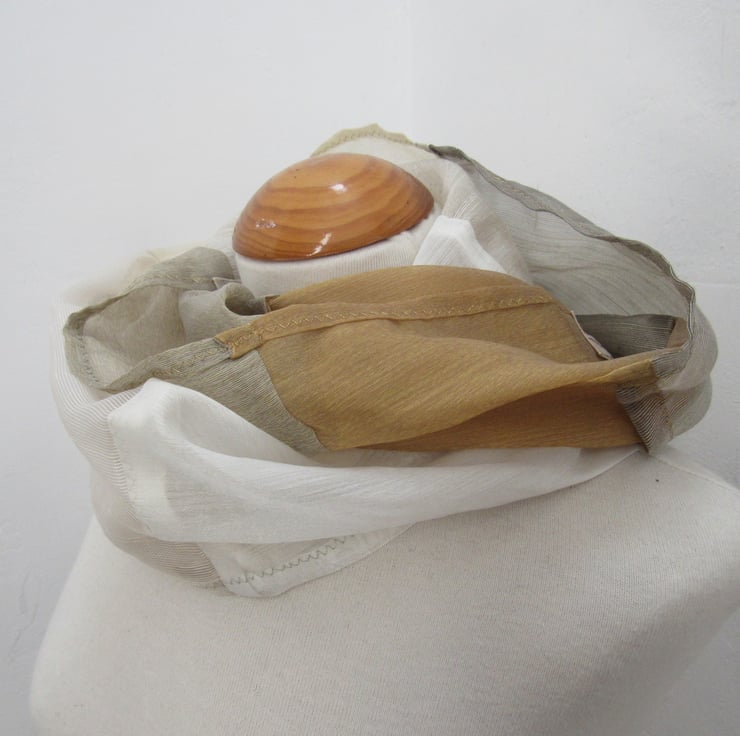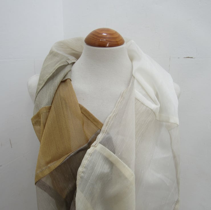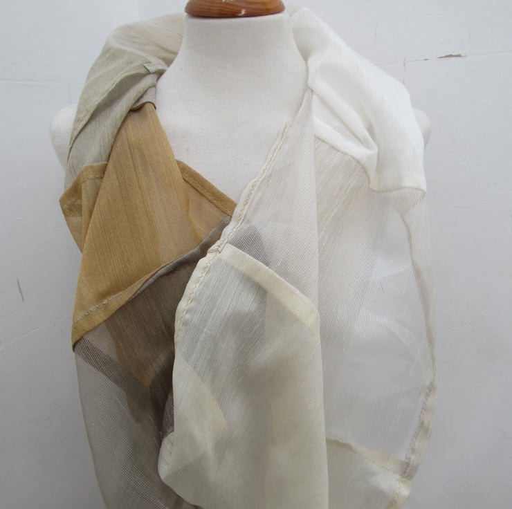 A long, single thickness patchwork cowl fashioned from lightweight polyester curtain samples, in shades of dark cream and earthtones.